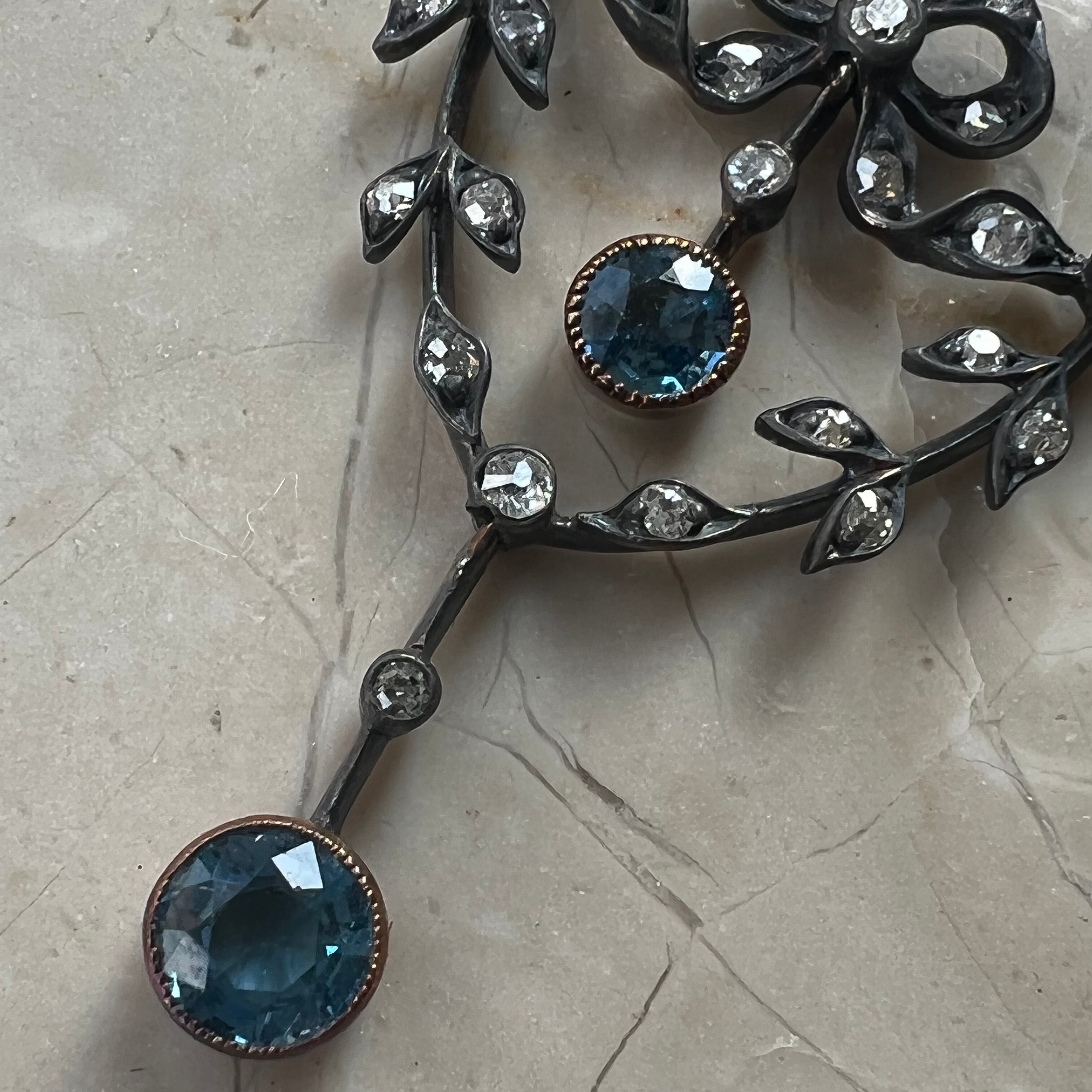 ブラジルのミナス・ジェライス州、サンタマリア鉱山から採掘される濃い色の美しいアクアマリンとは一体どの様な色なのかと長年思っていましたが、このアクアマリンのペンダントを見た時に本当にこれがあのサンタマリアだったのだ!と納得した真夏の空の様な濃いブルーのアクアマリンのペンダントです。ダイヤモンドで出来た白いリボンとブルー、ロマンチックなこのペンダントはターンオブザセンチュリー(世紀の変わり目)と呼ばれるこの1890年から1900年ごろにイギリスで製作されたと思われます。この時代に描かれたモネの睡蓮や多くの印象派の色調にも見られるパステルカラーはドレスの色として流行し、それに合わせて淡い色合いのパステルトーンのジュエリーが数多く作られました。美しいブルーのアクアマリンとダイヤモンドのチェーンから下がるダイヤモンドのリボンとガーランドのエレガントなデザインのペンダント。モネの絵画に描かれている様な貴婦人が美しいシルクタフタのドレスの胸元にこの美しいペンダントを身につけていたのかしら。。。と想像を膨らませてしまう様なペンダントです。アンティークジュエリーの中でもコンディションが良く大切にされてきた良品はオリジナルのボックスが付いている事も多いのですが、こちらのネックレスもこの形状を最もコンパクトにエレガントに魅せてくれる内側にアイボリーのシルクと紺色のベルベットが貼られた三角形のボックスに納められています。シンプルな薄手のニットのタートルネックやシャツ、Tシャツ、ワンピースやドレスなど今のお洋服の首元に合わせても素敵な装いが直ぐに完成する身につけやすいペンダントです。