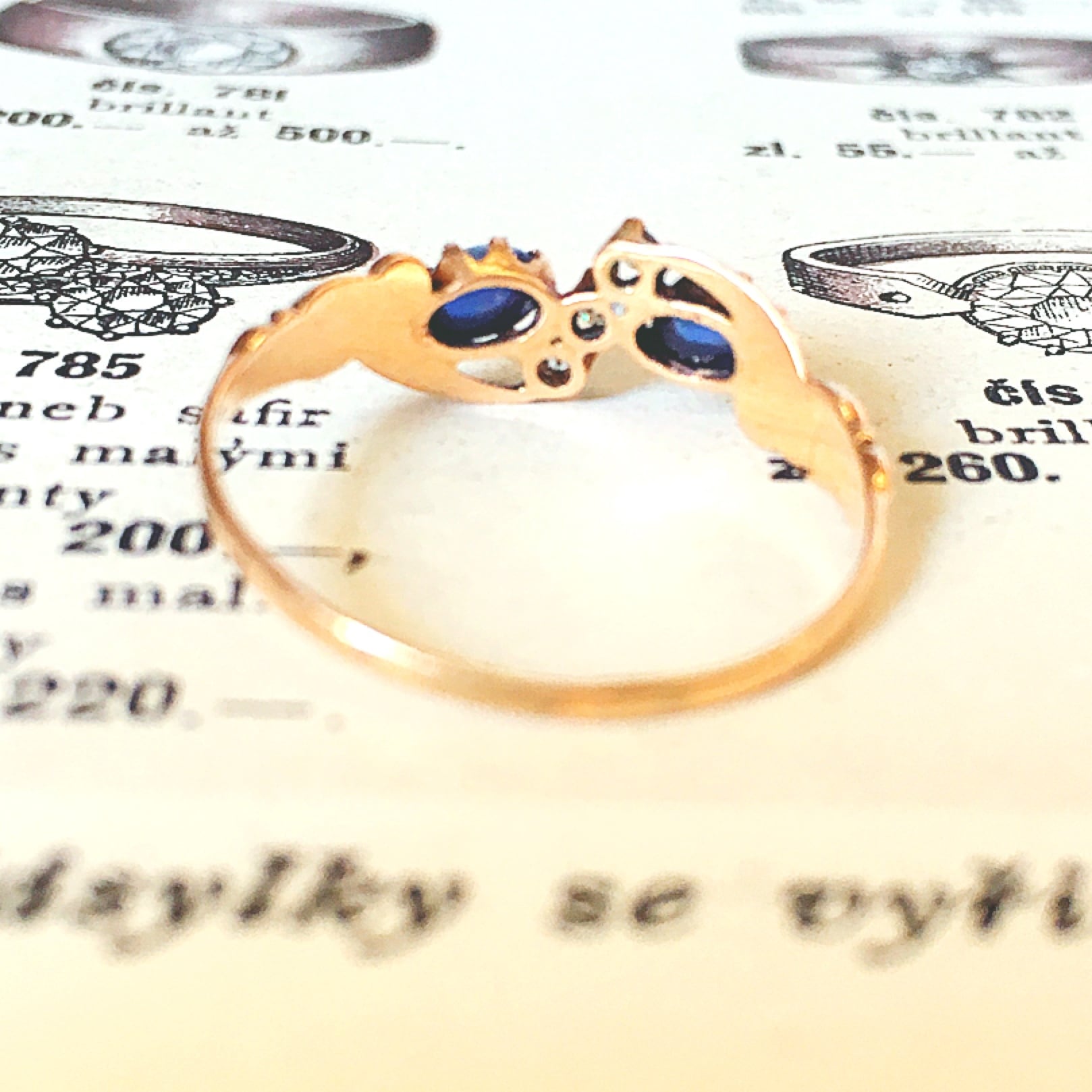 ペイズリー柄のような柔らかいラインのリング。深みのある色合いのふっくらとしたカボションサファイアが2つ。その間にメレダイヤモンドが3粒寄り添って、2粒のサファイアの大きめの爪はそれ自体もデザインの一部となり愛らしいリングを引き立ててます。