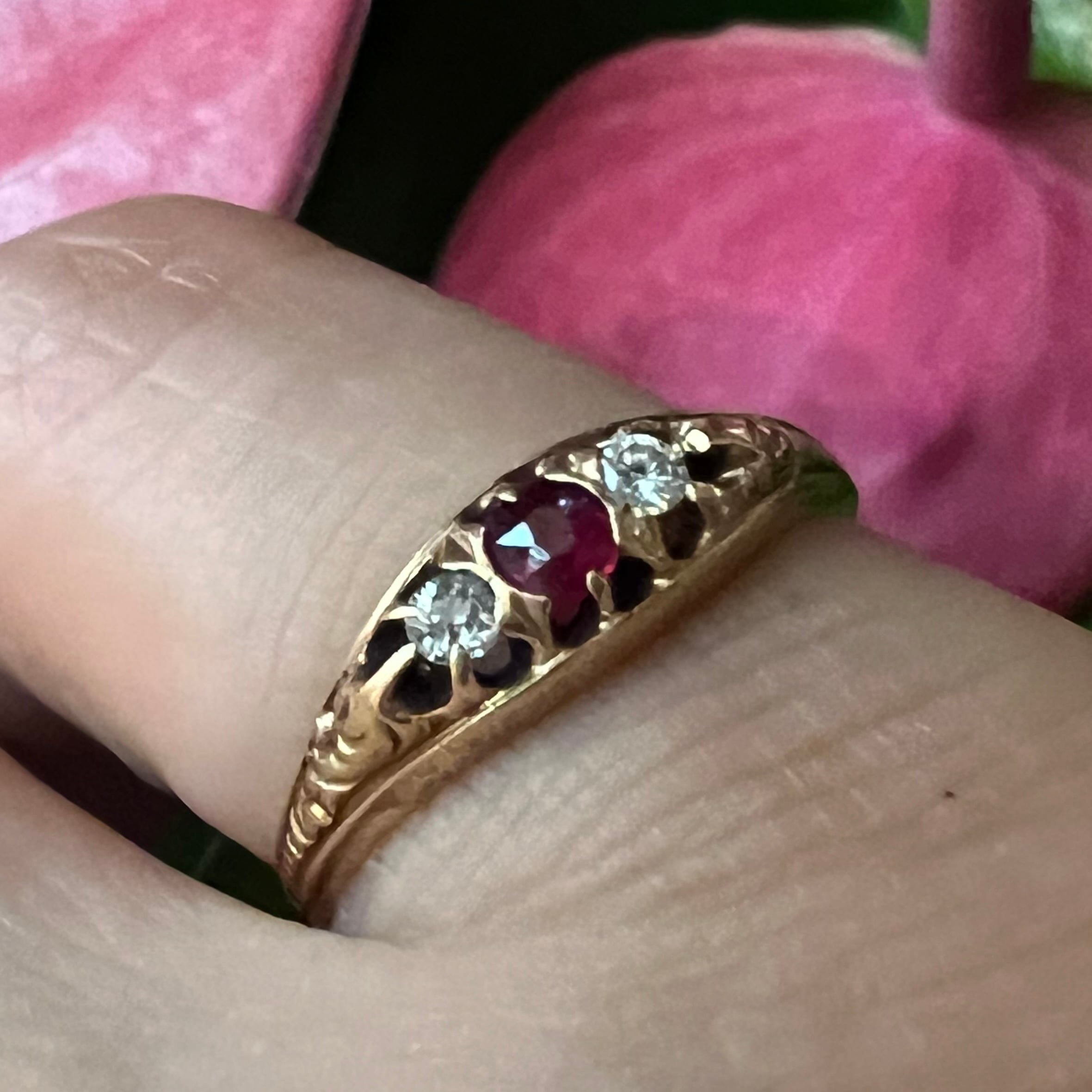 華やかなルビーの色とダイヤモンド、細かなテクスチャーのリーフモチーフが美しいリングです。一見、クラシカルに石を並べただけのリングですが、石の高さやシャンクの高さ、リーフの細かな模様などアンティークジュエリーならではの工夫が施されています。アンティークのファーストリングとして現代もののジュエリーと合わせても違和感のない美しさを持ったリングです。アンティークゴールドならではの少しローズ色がかかったゴールドの色も日本人の肌に肌馴染みが良く身につけやすい華やかで綺麗なリングです。