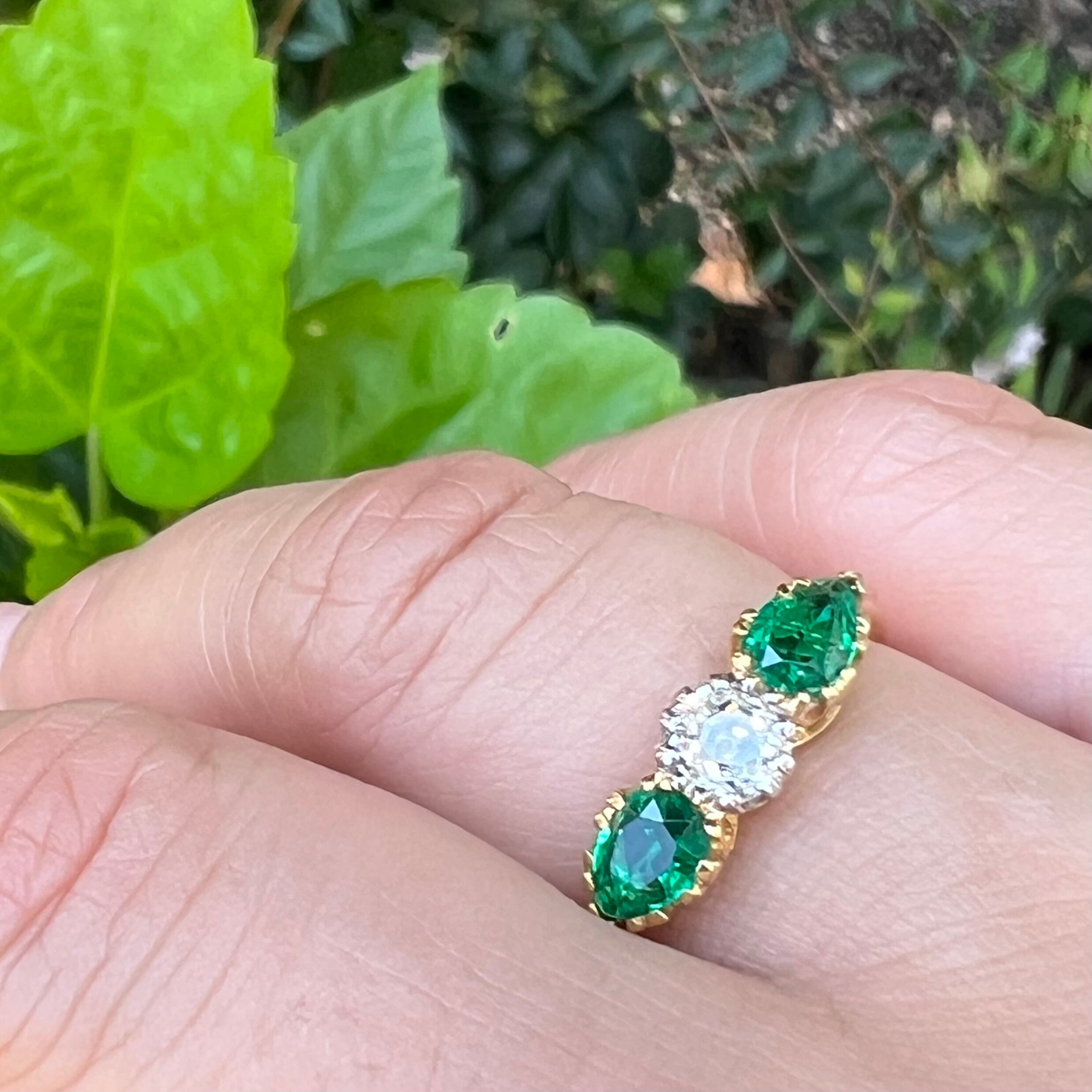なんと美しいリングでしょう!この美しさはなかなか写真に撮れずもどかしい気分でいっぱいです。1880年から1900年にイギリスで製作されたと思われるリングですが、ノンオイルの瑞々しいエメラルドの色、深みのあるオールドカットダイヤモンドのウルウルとした輝きの組み合わせがまるで昨日作られたばかりの様なフレッシュで新鮮な印象を与えます。
