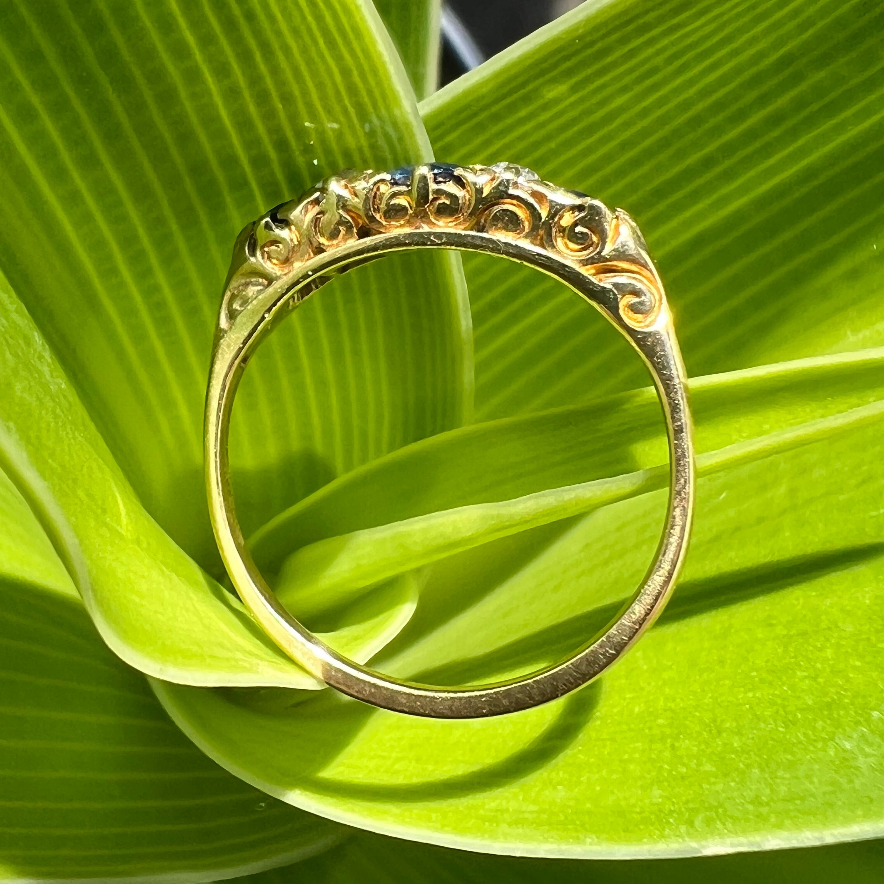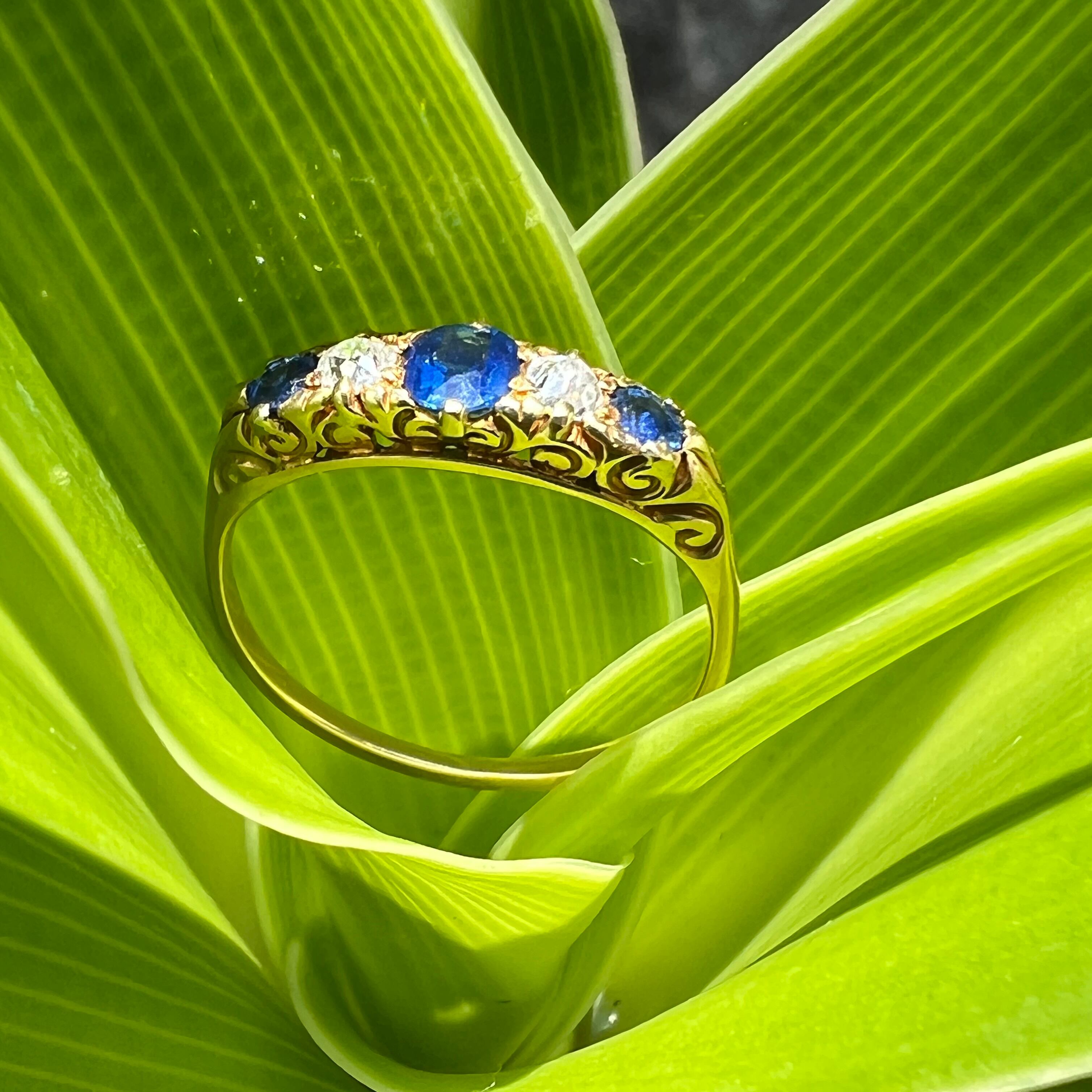 小粒ながら美しいサファイアを3つ並べ、間にオールドクッションカットダイヤモンドをあしらった、1880年頃から1900年の初めにかけて製作されたと思われる美しいサファイアとダイヤモンドのファイブストーンリングです。このようなファイブストーンリングはヴィクトリア時代に流行し、ルビーの他にサファイアやエメラルドなどでも作られエンゲージリングとしても大変人気がありました。以前は買い付けに行くと、この様なリングを何本も仕入れができたのですが、今では良質の物、特に石の綺麗な物はどんどんマーケットから姿を消しているような気がします。