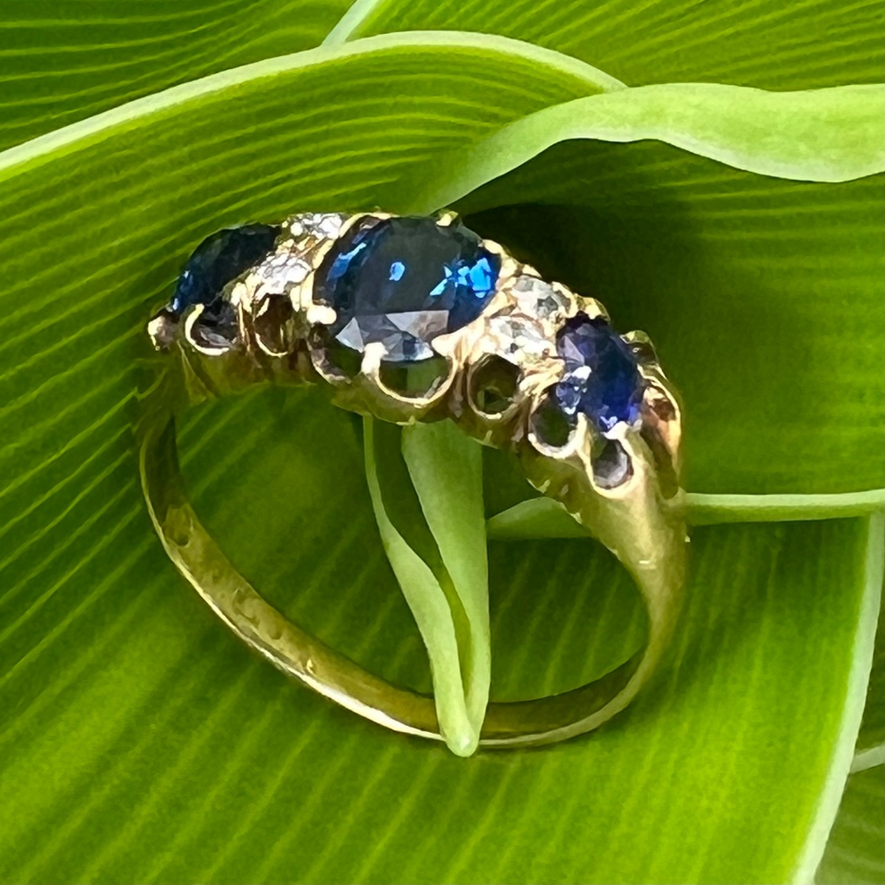 センターは大きさのしっかりとあるインクブルーの青いサファイアを小粒のクッションカットのダイヤモンドを縦に二つ並べてサイドに配し、大きさの微妙に異なる小さめのサファイアを両端にあしらってゴールドにセットしたクラシカルなハーフフープのスリーストーンリングです。