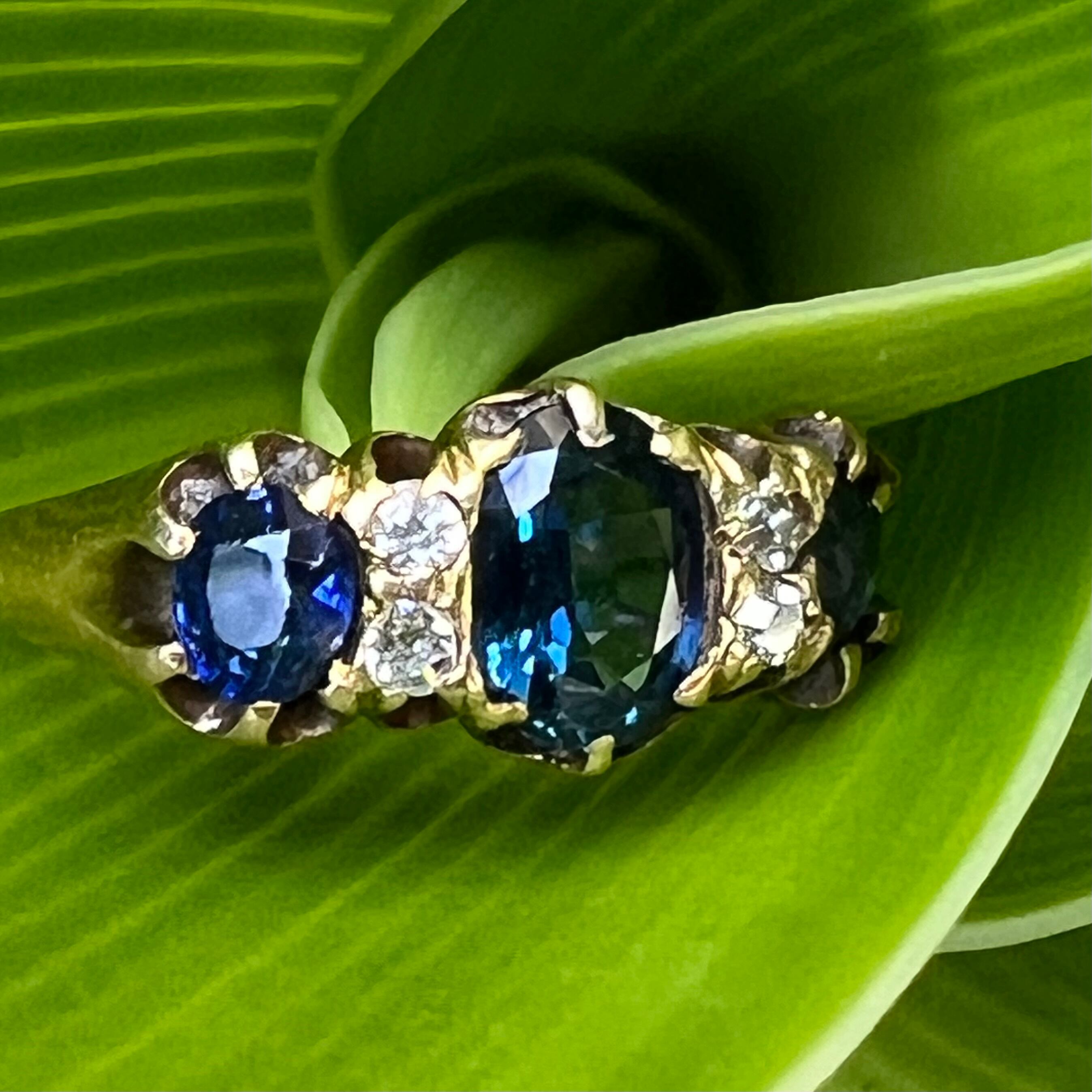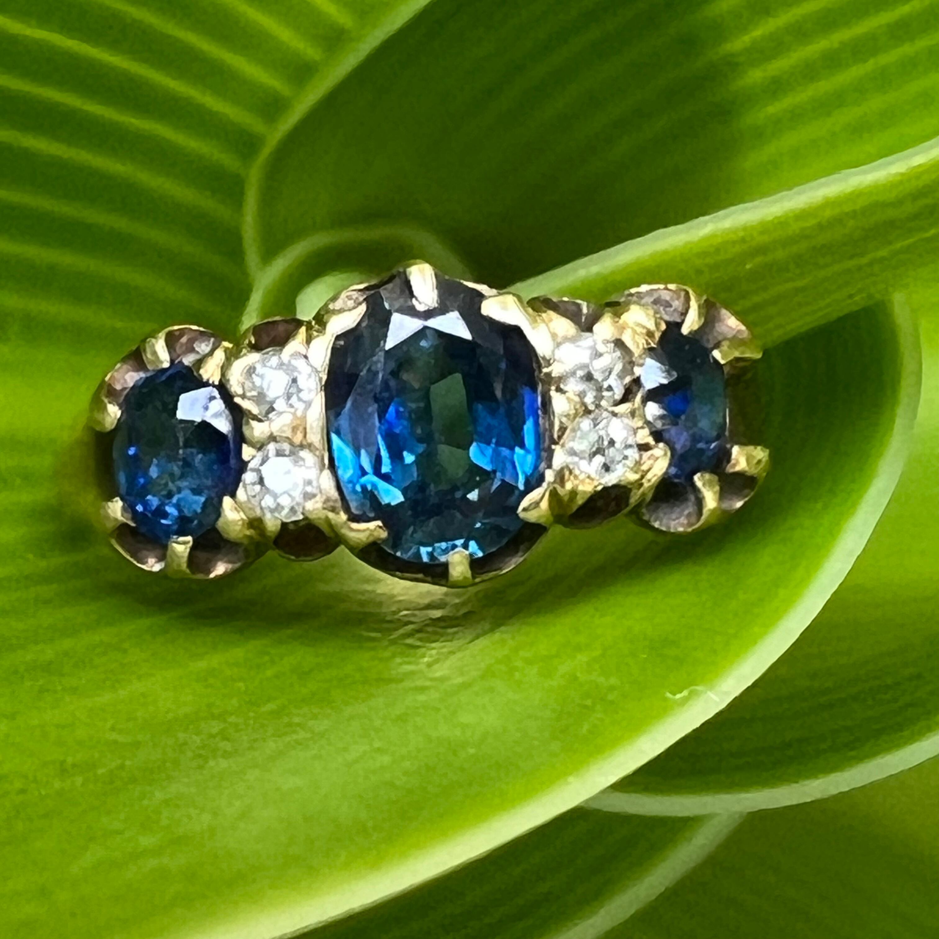 印象的なインクブルーのサファイアと小粒のオールドマインカットダイヤモンドのコンビネーションが美しいイギリスで19世紀中期に作られたと思われるスリーストーンリングです。