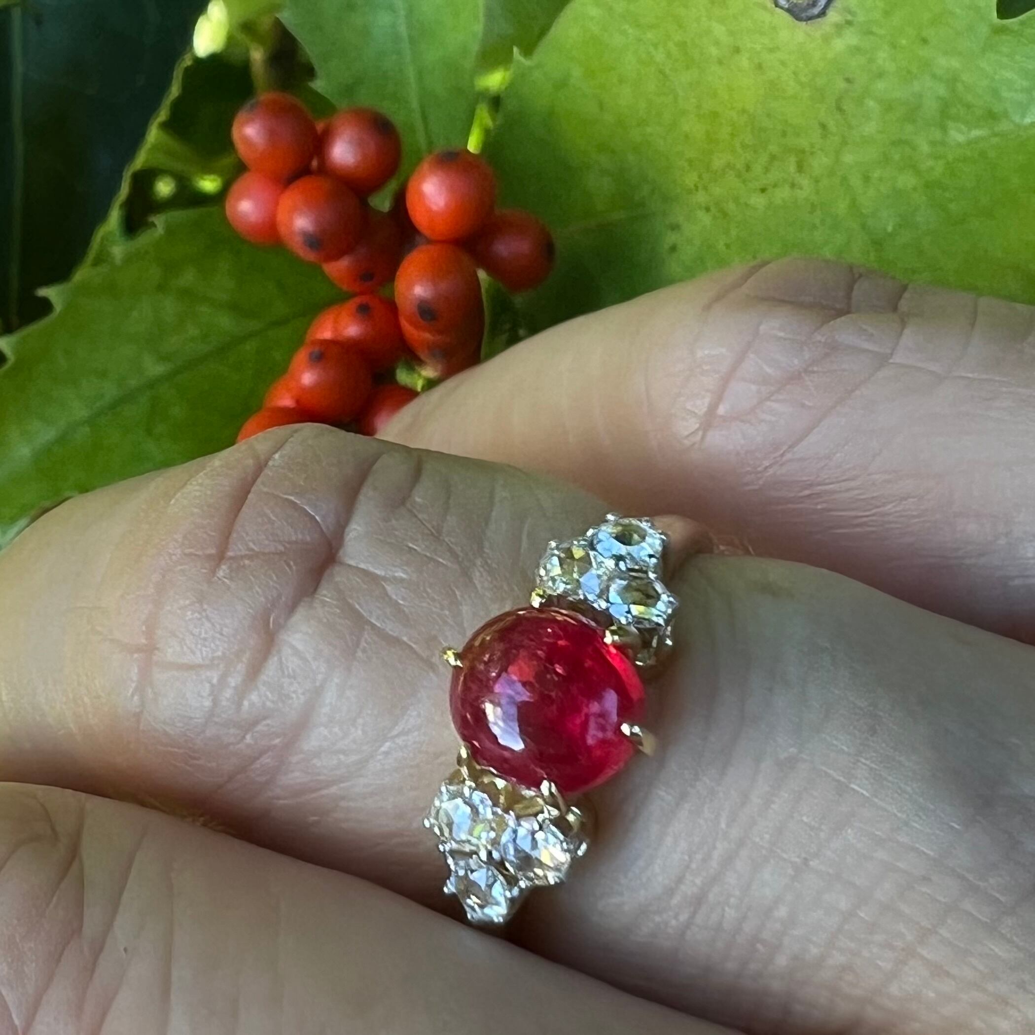 石の中のインクルージョンが真っ赤なカボションスピネルの中にさらに火を灯した様な輝きを持たせ、ハイドームのウルウルとした白い輝きのローズカットが光をより魅力的に見せてくれます。