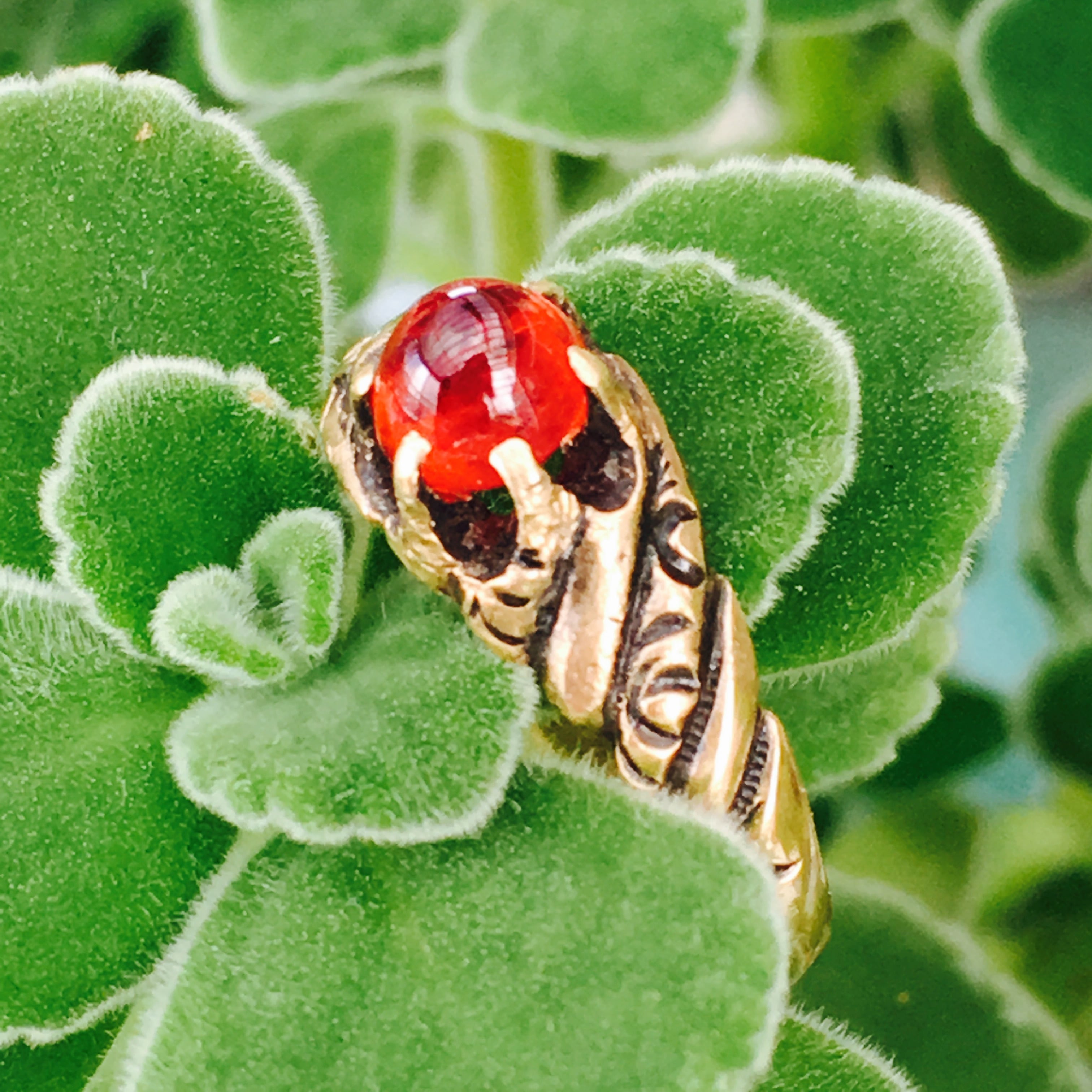ゴールドの美しいヴィクトリアンリング特有のエングレイビングのシャンク。クローセッティングと呼ばれる動物の爪の形のような爪にセットされた真っ赤なスピネル。アンティークリングの良さが小さなリングの世界にぎゅっと凝縮されたかのような美しいリングです。