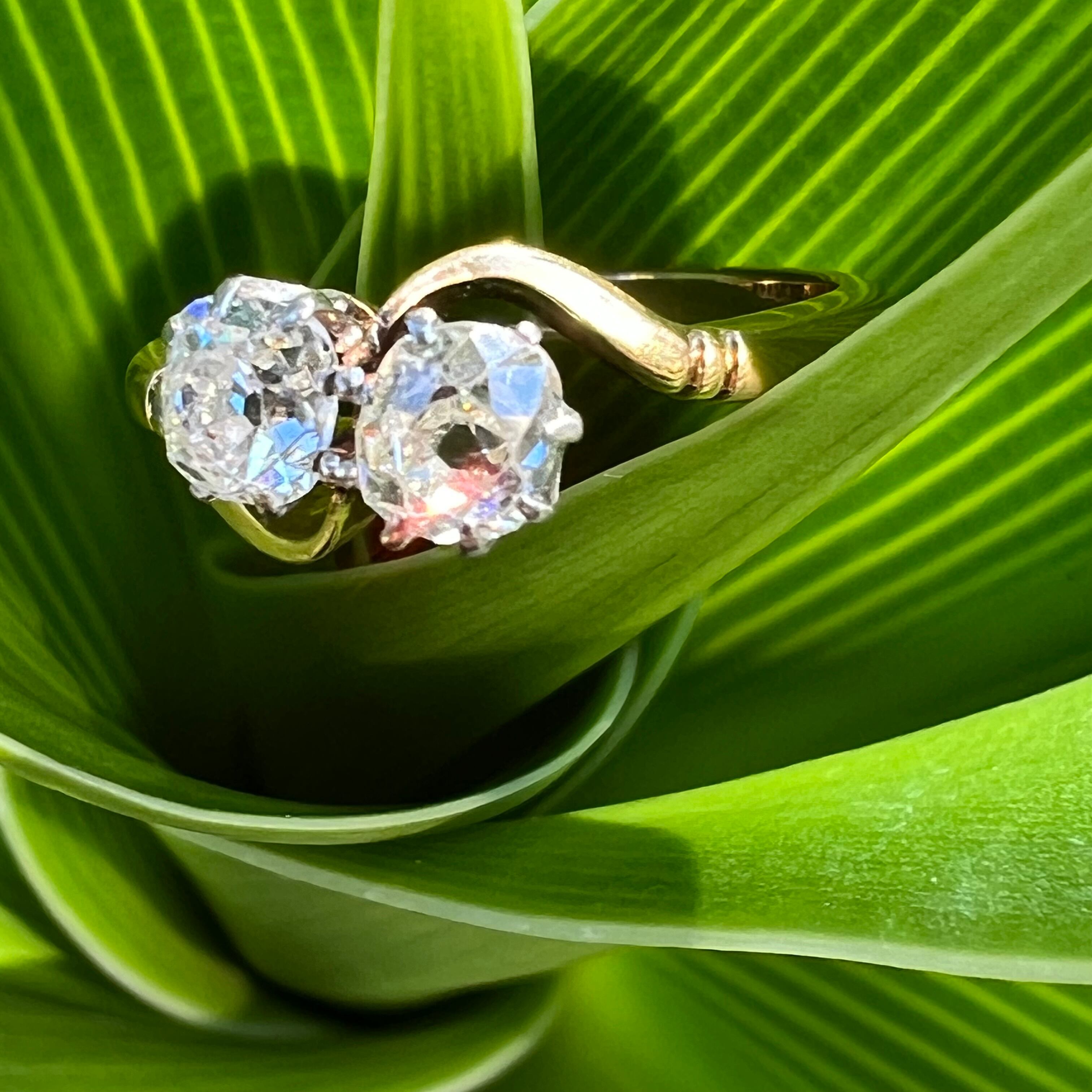 比較的大粒のクッションカットのダイヤモンドをふた粒寄り添うように並べたトワエモアリングです。アンティークジュエリーには意味を持つものがよくありますが、フランス語であなたと私の意味を持つトワエモアは19世紀末から20世紀初頭にかけて愛し合う2人を表す婚約指輪としてヨーロッパで人気がありました。