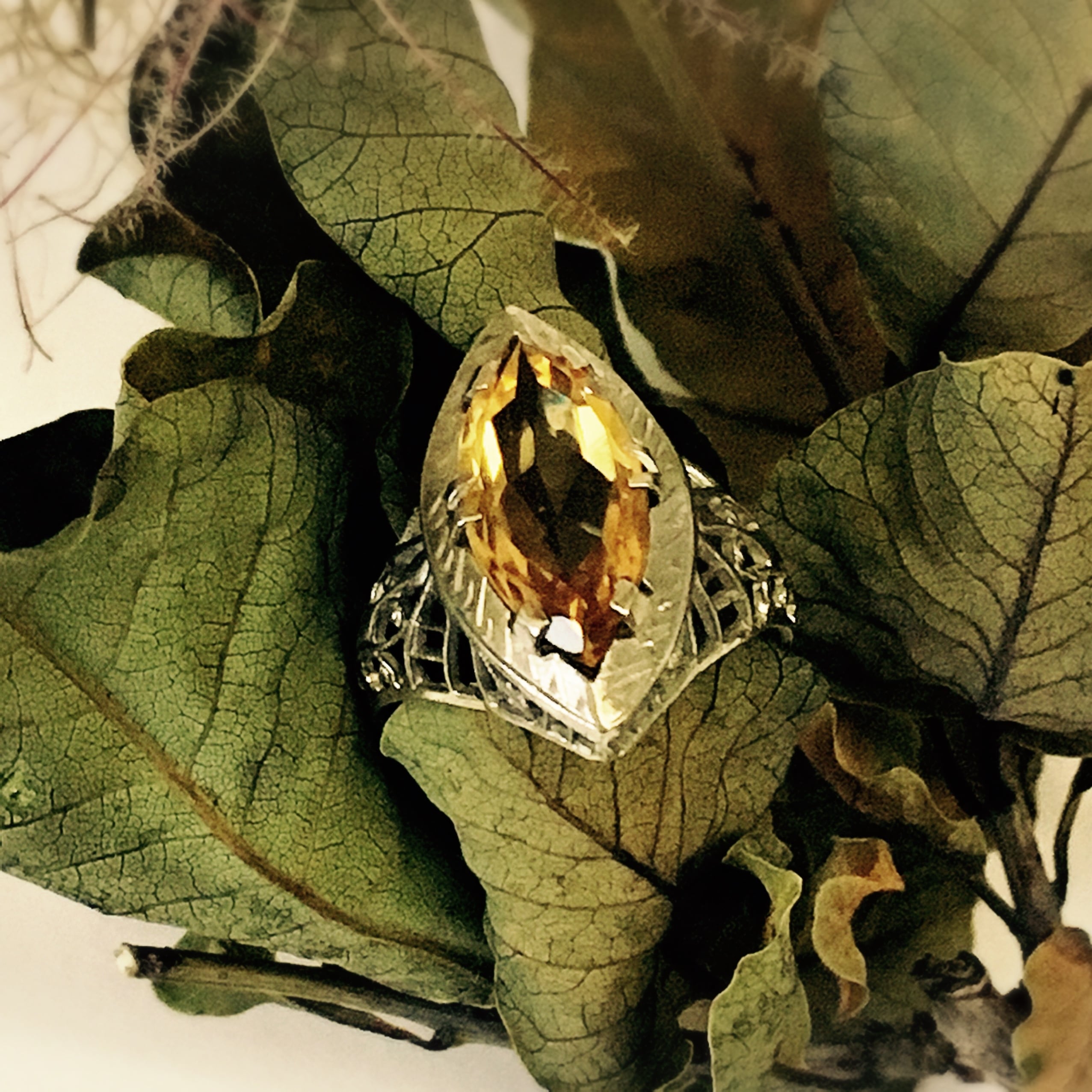 秋の哀愁たっぷりの陽の光を連想させるオレンジがかったディープイエローカラーのシトリンリング。まるで色づいた葉に太陽が当たっているかのような輝きには奥行きが感じられ、ついつい手元を見てしまいがちになります。