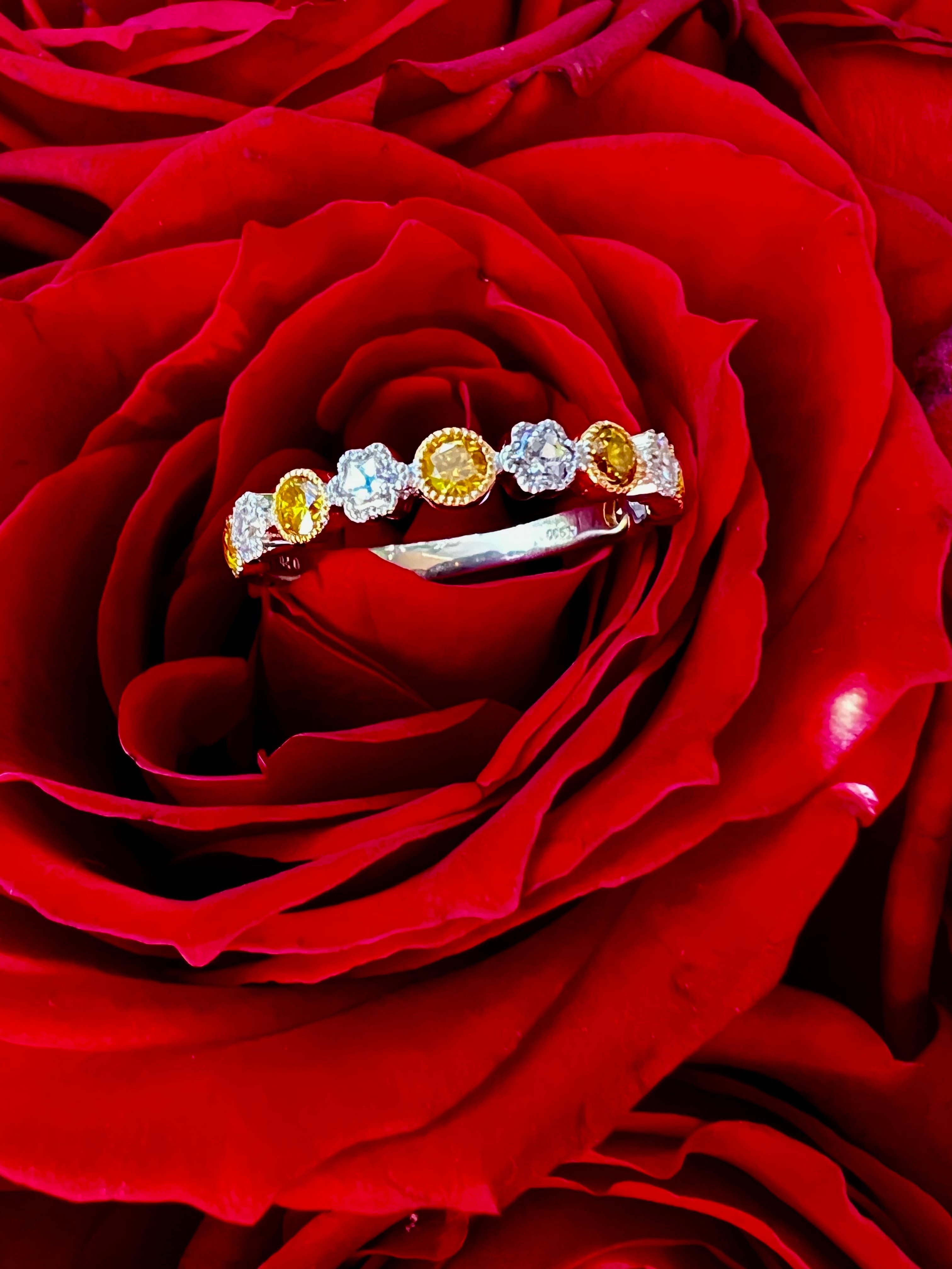 キラキラと心ときめく小さな星の形にカットしたダイヤモンドをプラチナに5ピース、華やかで輝きの素晴らしいオーストラリア、アーガイル産の稀少なオレンジダイヤモンドを6ピースイエローゴールドに交互に豪華にセットしたリングです。