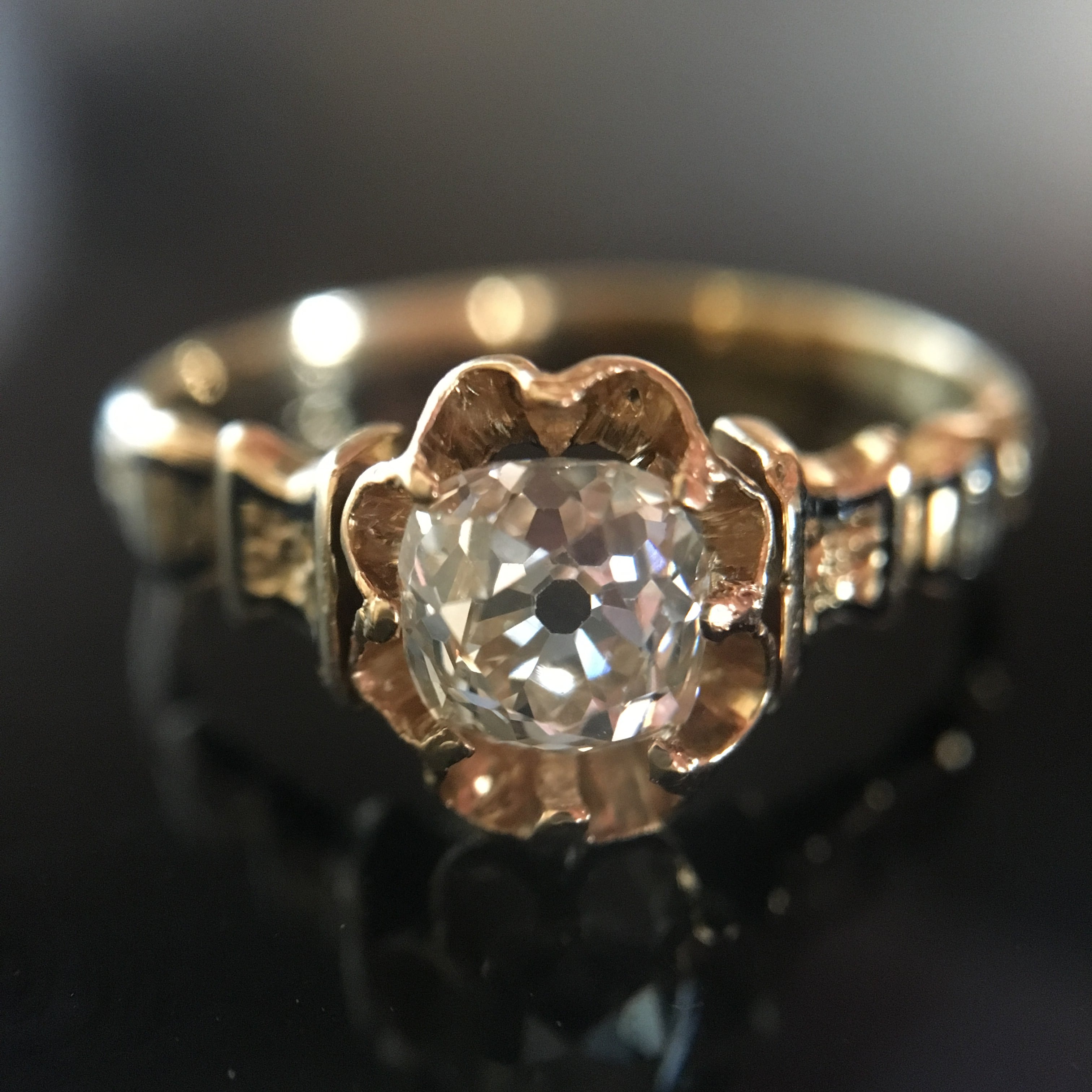 シャンク部分にはブラックエナメルが施され、リングを横から眺めた時の雰囲気は燭台に灯る炎のようで、どこからみても隙のない美しさに惚れ惚れしてしまいます。