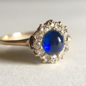 イギリスのダイアナ妃の婚約指輪はオーバルのサファイアをダイヤモンドで囲んだクラスターリングでした。中心に大きめの石を配して小さな白いダイヤモンドで囲ったクラシカルなデザインは伝統的にヨーロッパ、特にイギリスでは時代を超えて人気があり、アンティークのこの様なクラスターリングはエンゲージリングや記念のギフトとしてもとめる人が多いように思います。