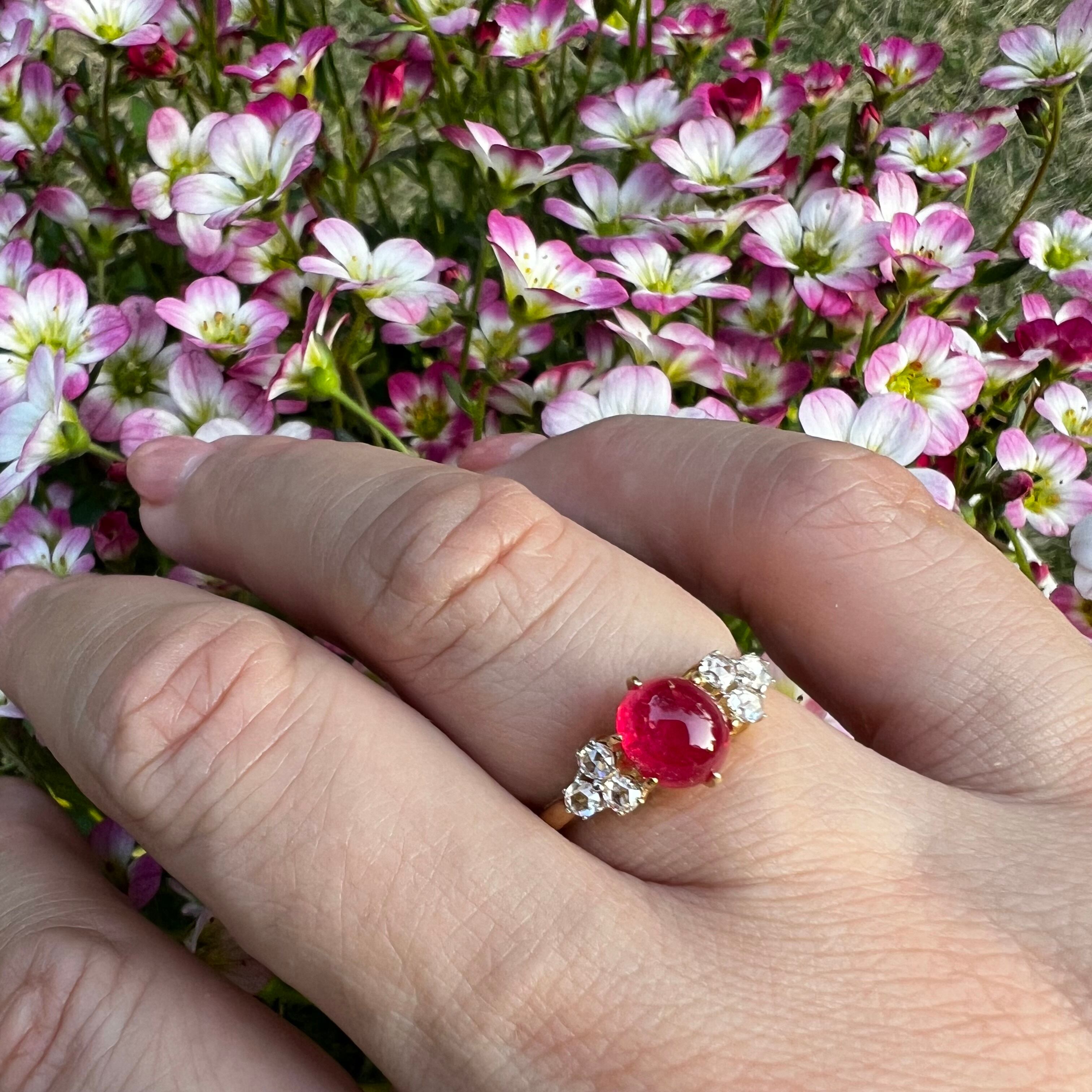 とろんとした赤、1.8ctの大粒の稀少なカボションカットのレッドスピネルと、ローズカットダイヤモンドを贅沢に使ったリングが出来ました。