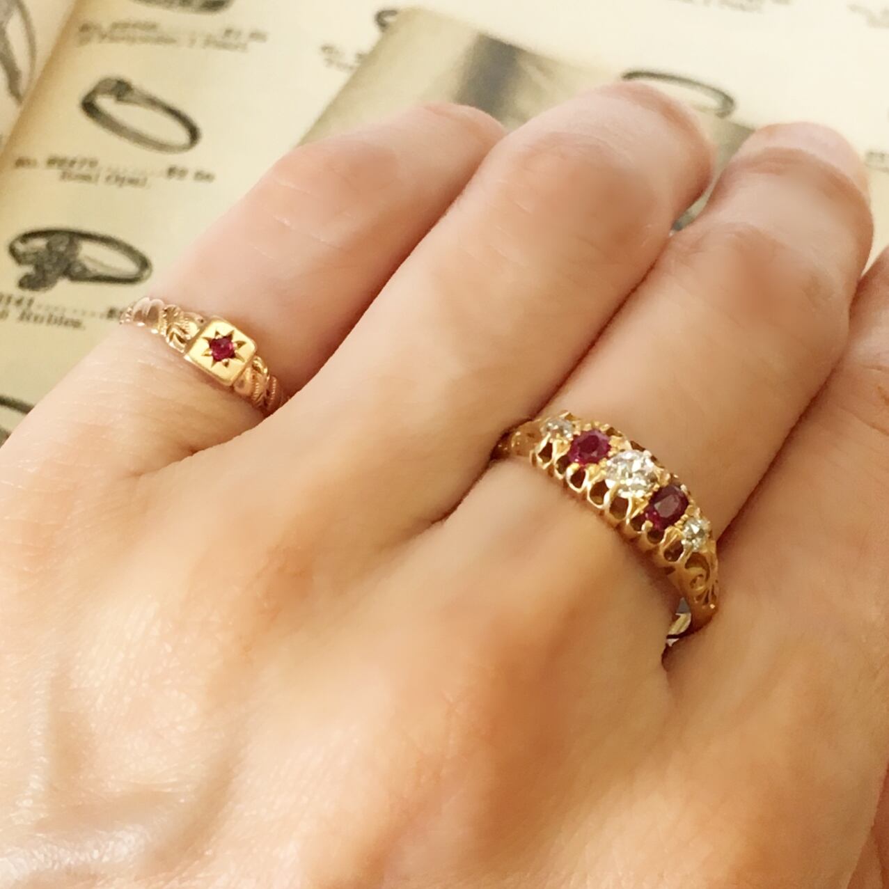 小さい小さいルビーとツイストされたシャンクが可愛いピンキーリングのご紹介です。