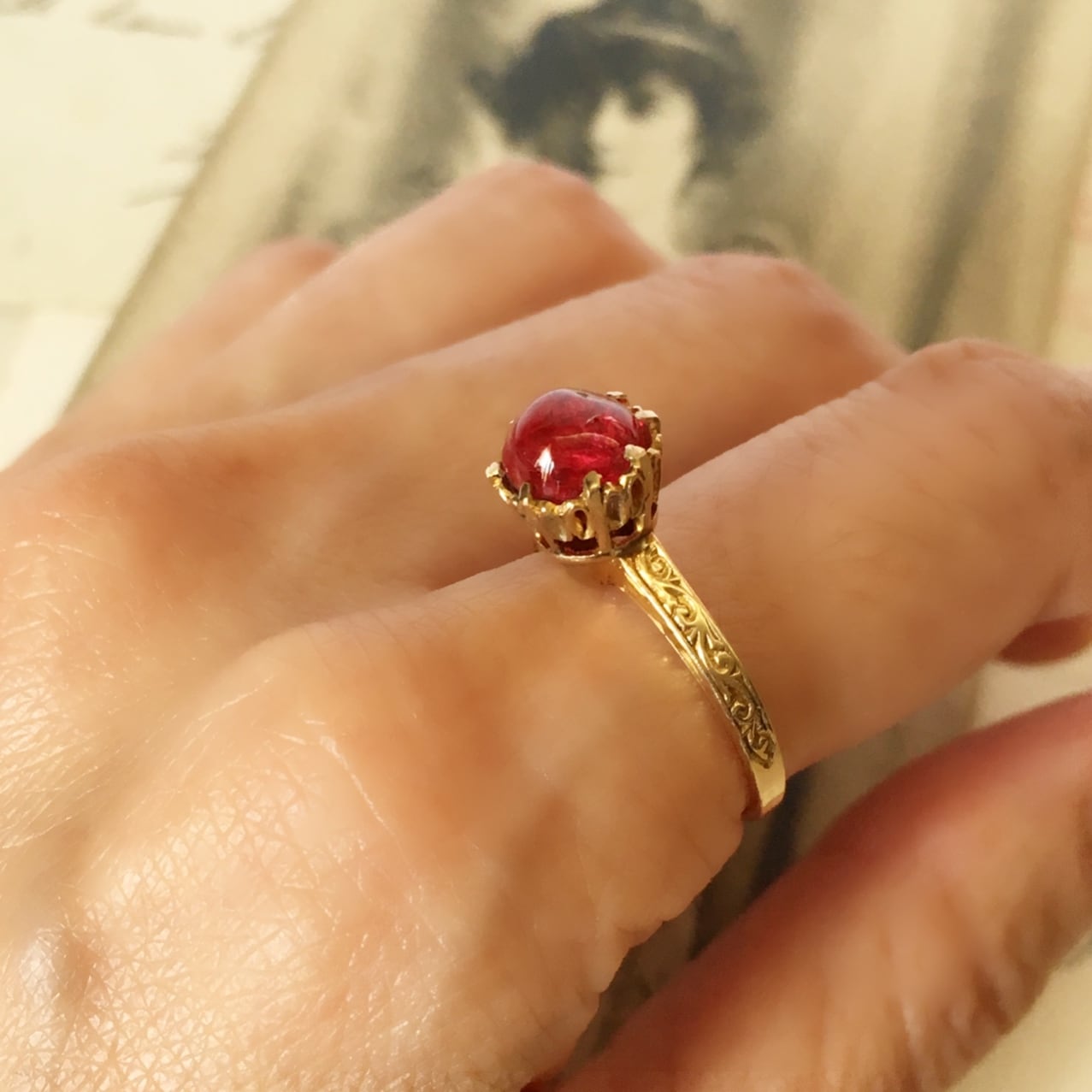 高くセットされた台座にすっぽりと佇んでいるスピネルの姿がなんとも言えず愛らしく、ゴールドの美しいヴィクトリアンリング特有のエングレイビングのシャンクに映え、アンティークリングの良さが小さなリングの世界にぎゅっと凝縮されたかのような美しいリングです。