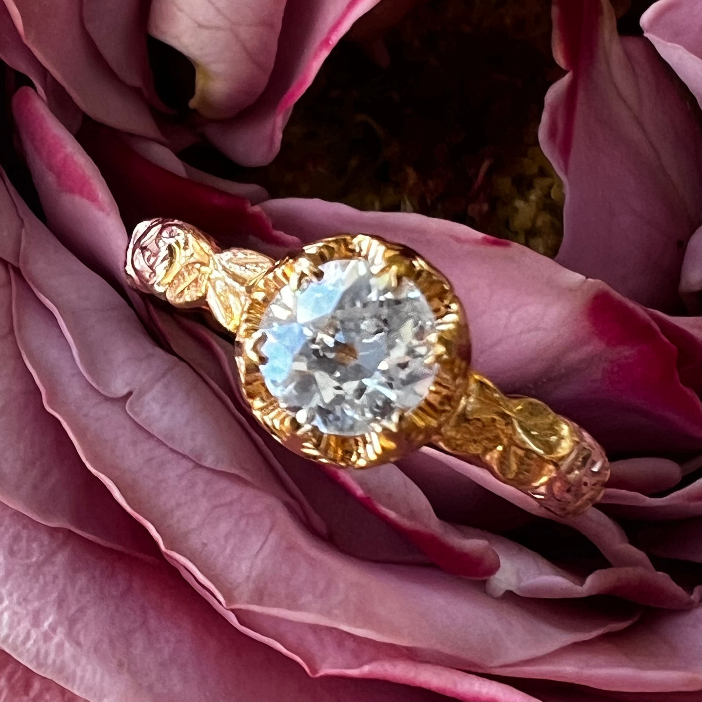 オールドヨーロピアンカットのダイヤモンドを使ったアンティークスタイルのゴールドリングです。このリングに使用してあるオールドヨーロピアンカットのダイアモンドはこだわって長年コレクションして来た物です。ダイヤモンドはオリジナルのアンティークスタイルの王冠の様なセッテイングにセットし、リングのシャンクにはローズゴールドで薔薇の花とイエローゴールドで葉をデザイン。少し艶消しの薔薇の模様が美しいリングです。0.62ctのオールドヨーロピアンカットのダイヤモンドは約5.25mm。こだわってコレクションをしたダイヤモンドの見た目も大きく、美しい薔薇の模様が華やかなリングです。お値段もコレクションのダイヤモンドを使ってとてもリーズナブルに出来ています。