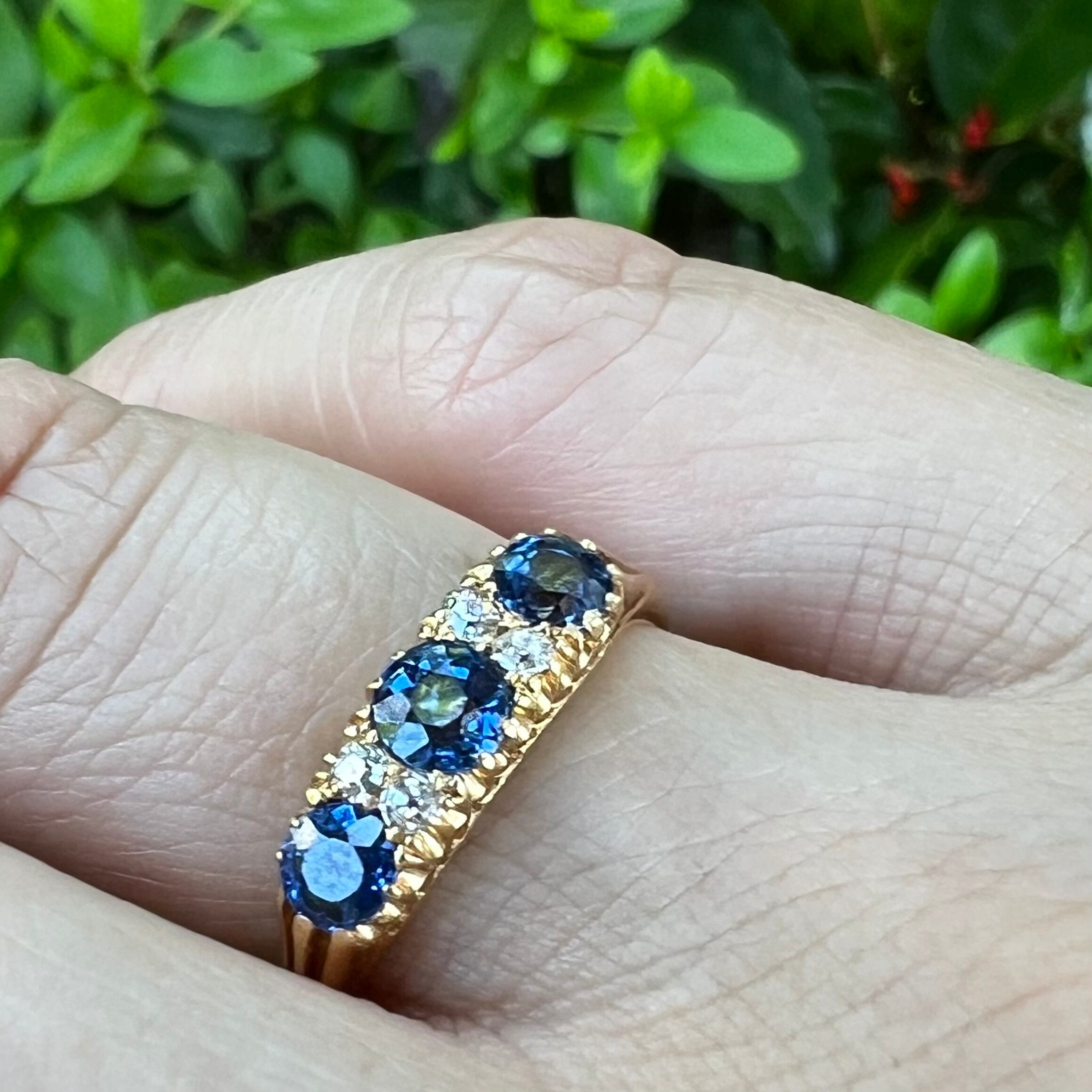 美しい3つのブルーのサファイアの間には小粒のオールドマインカットダイヤモンドをふた粒並べ、はっきりとした色のコンビネーションがややイエローゴールドに生える華やかでクラシカルなハーフフープのスリーストーンリングです。