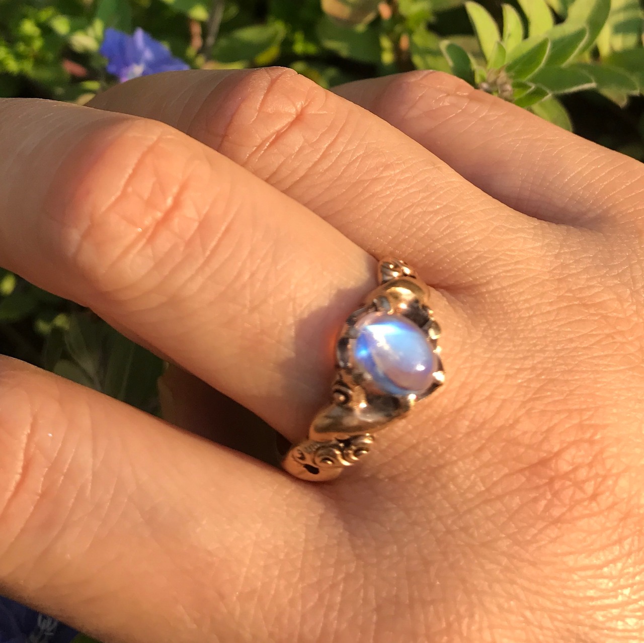 透明感のある青い澄んだ石の中に少しの光が差すことによりより鮮やかな青い色が浮かび上がる神秘的な光を持ったムーンストーンのリングです。