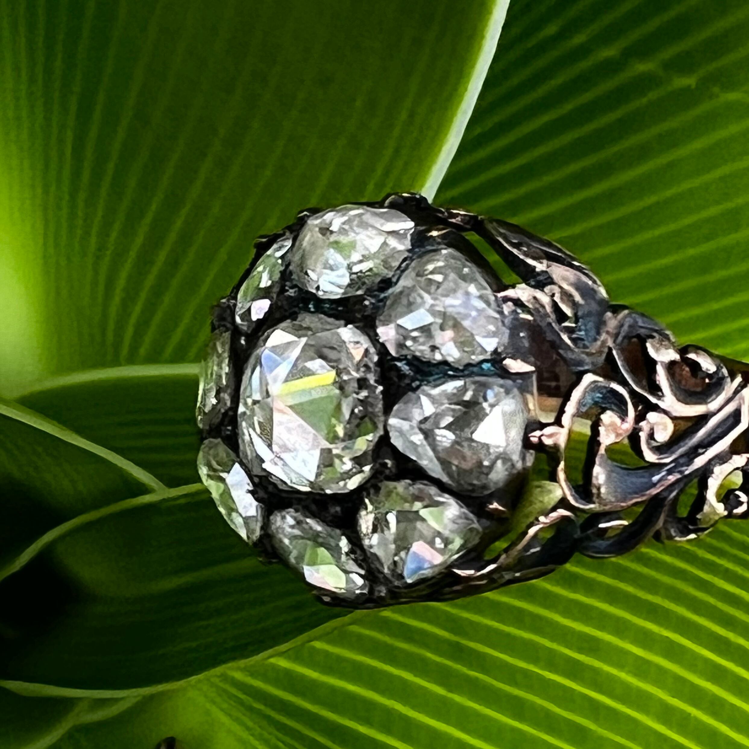 19世紀中期から末、1860年頃から1880頃までに作られたローズカットダイヤモンドのクラスターリングです。コロコロとした厚みのある異なる形のギラリ、ギラリと光るローズカットのダイヤモンドは裏を閉じ、箔を入れたたフォイルバックが施され、素晴らしい輝きを放ちます。