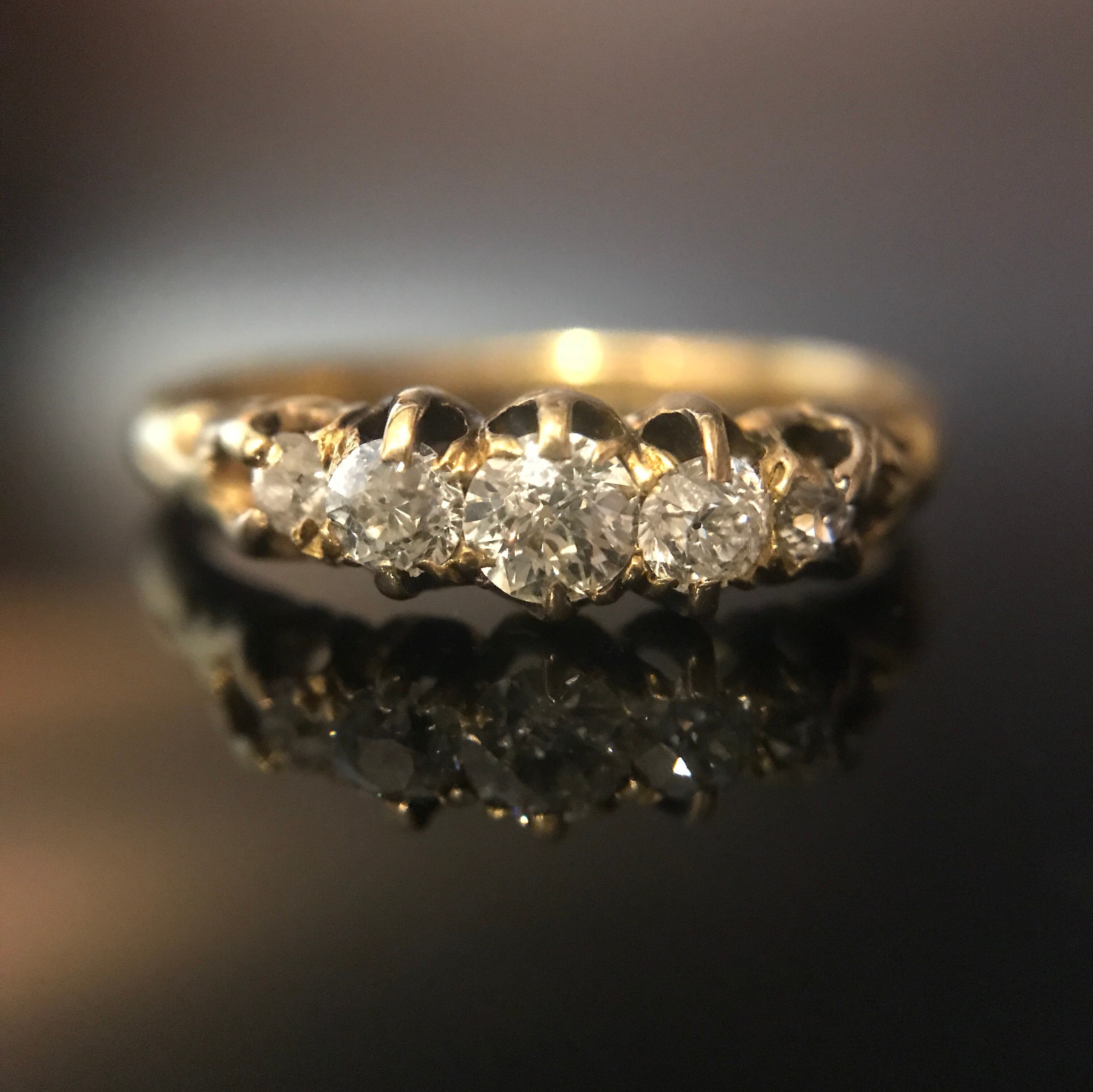 人気のヴィクトリアンファイブストーンリングです。ラウンドのオールドヨーロピアンカットのダイヤモンドを並べた極めてオーソドックスでクラシカルなデザインは普段使いに1本でしてもマリッジや色石のリングと重ねてつけても大丈夫です。オールドヨーロピアンカットのダイヤモンドはひとつひとつしっかりと爪留めされ、ダイヤモンドの横には当時ジュエリーデザインに多用されていた百合の紋章がデザインされています。