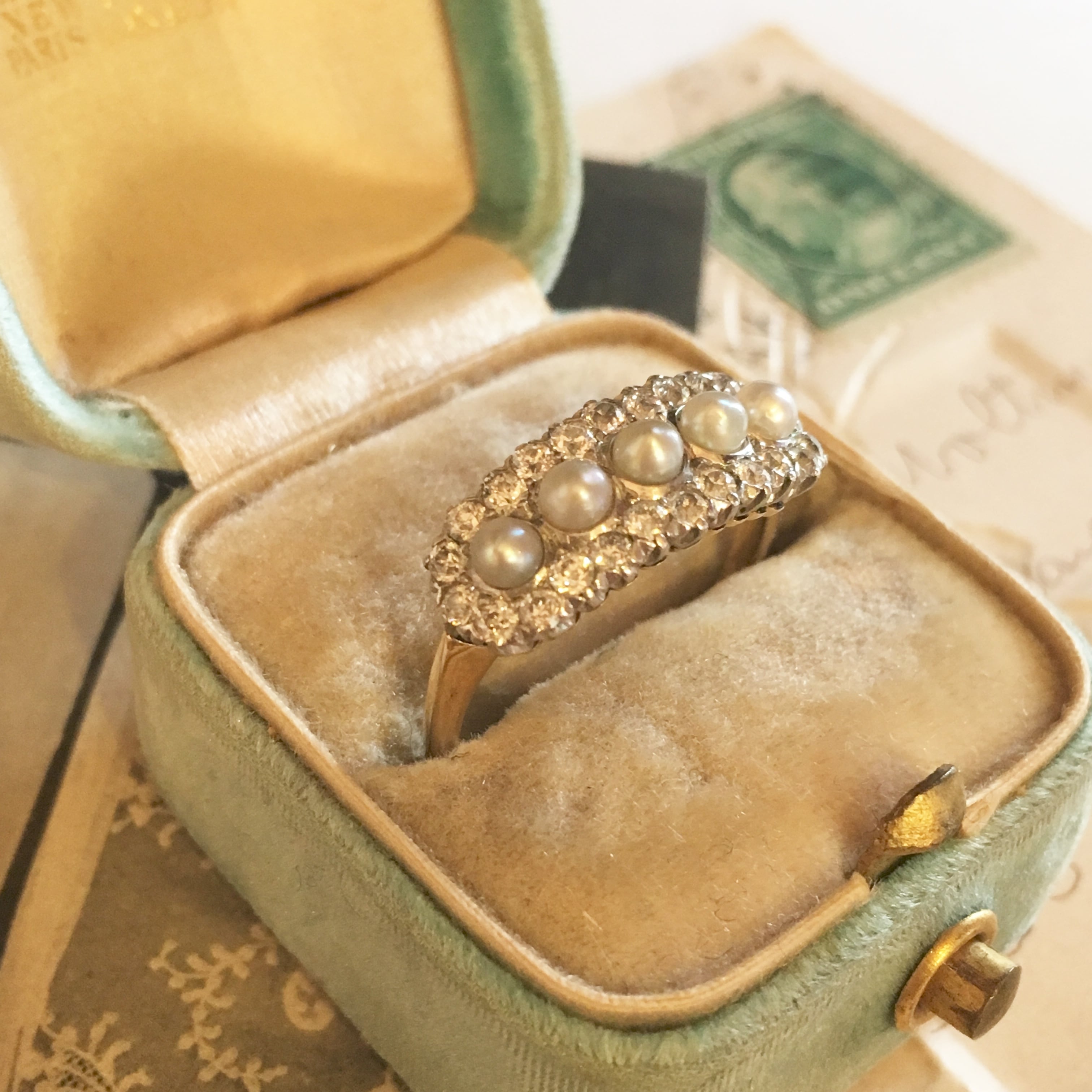 ナチュラルパールのホワイトグレイッシュな光沢とダイヤモンドの煌めきが美しいコンビネーションのエドワード時代のリングです。