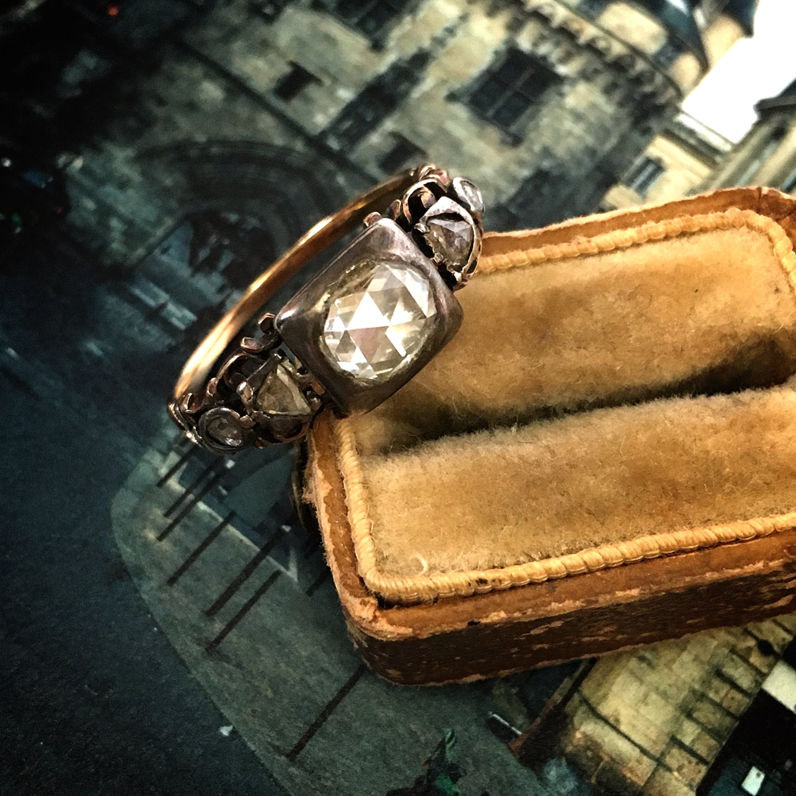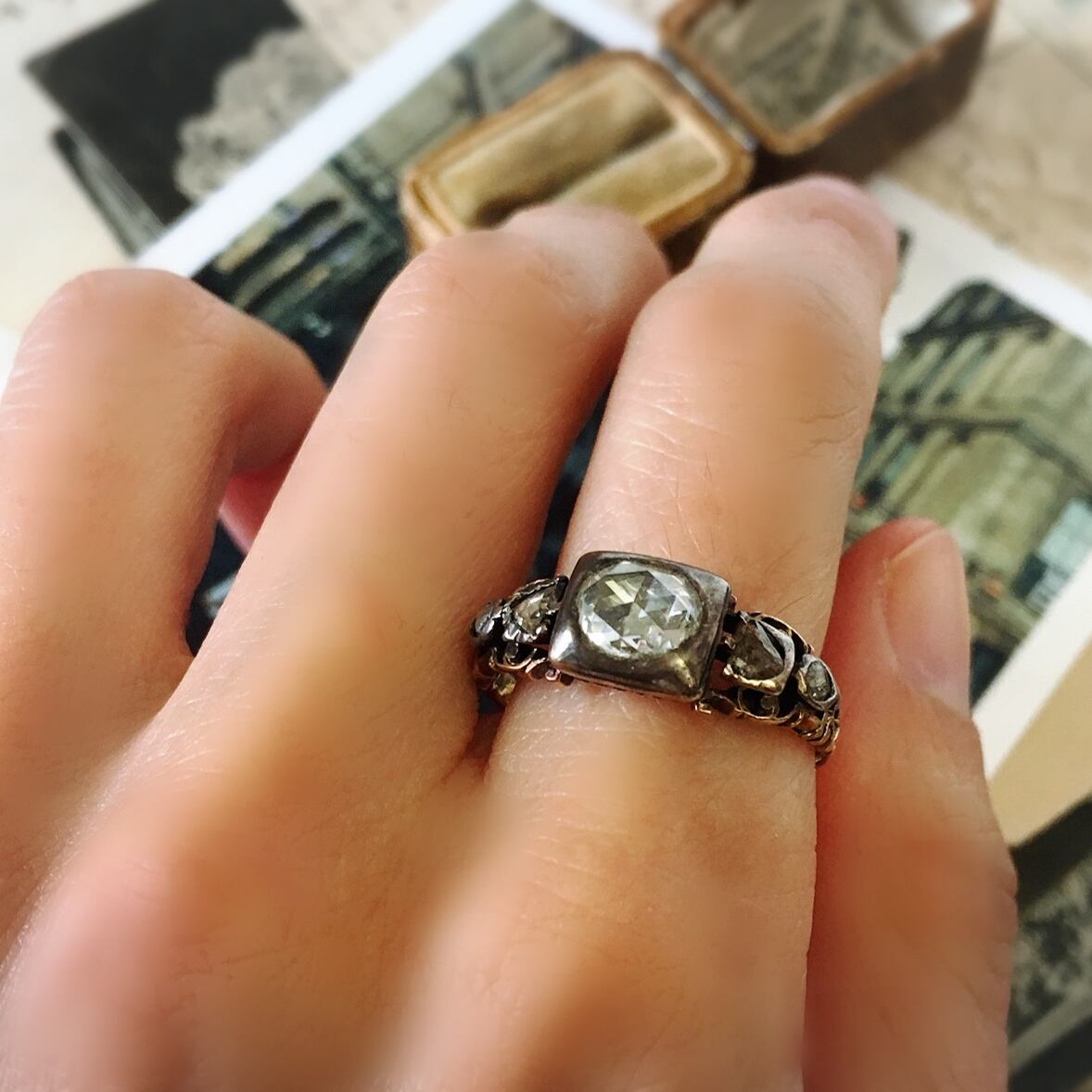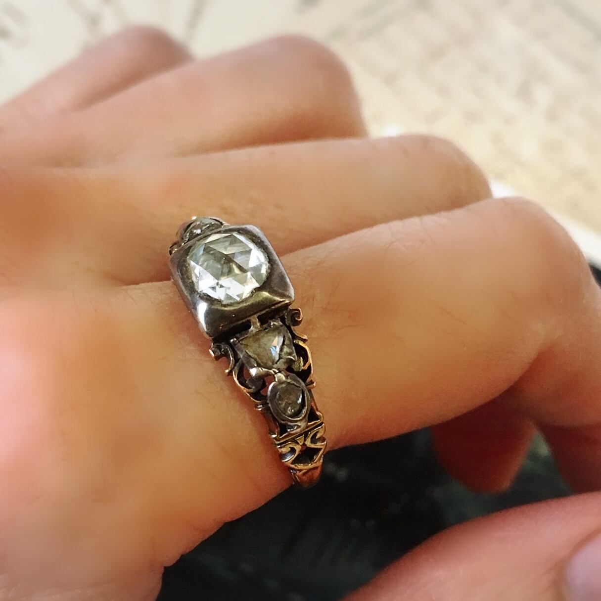 シルバーでフォイルバックされたローズカットダイヤモンドがゴールドのシャンクにセットされ、厳格な雰囲気が漂うジョージ王朝時代のリングです。