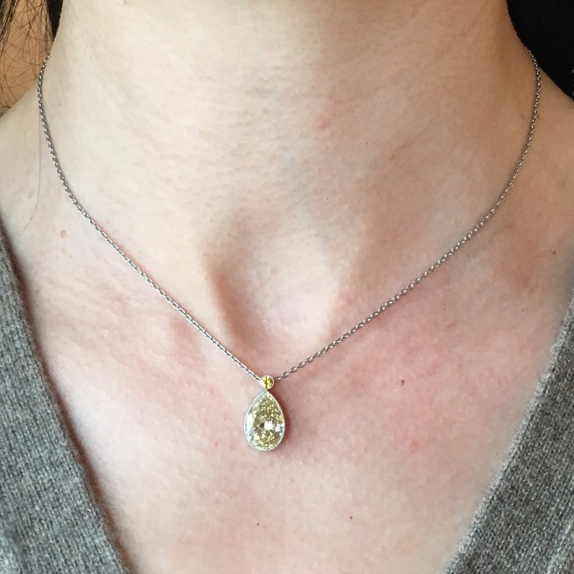 この美しい輝きと大きさ、迫力を写真でお伝えできないのが残念! 大粒2.5ctの迫力の大きさのイエローダイヤモンドのドロップペンダントです。アンティークジュエリーを買い付ける際に時々これ!と思った素晴らしく美しい石に出会ってしまう事がありますがこの石もそんな石。10年以上前魅了されて購入したイエローダイヤモンドを元気の出るビタミンカラーのパンプキンカラーのダイヤモンドを合わせてペンダントにお仕立てしました。繊細なミル打ちや、動きに合わせても常にダイヤモンドが中心に来る様にこだわった作りは、ヴィクトリアンボックスとコラボレーションして26年目の熟練職人さんの手作り。本当にお買い得な価格でのご提供です。