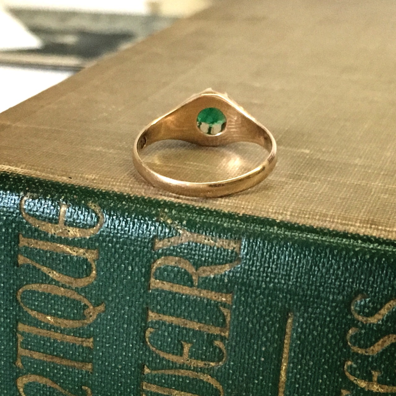 艶やかな深緑グリーンのエメラルドがほんのりと古美がかかったゴールドのマウントに映えるヴィクトリアンリングです。
