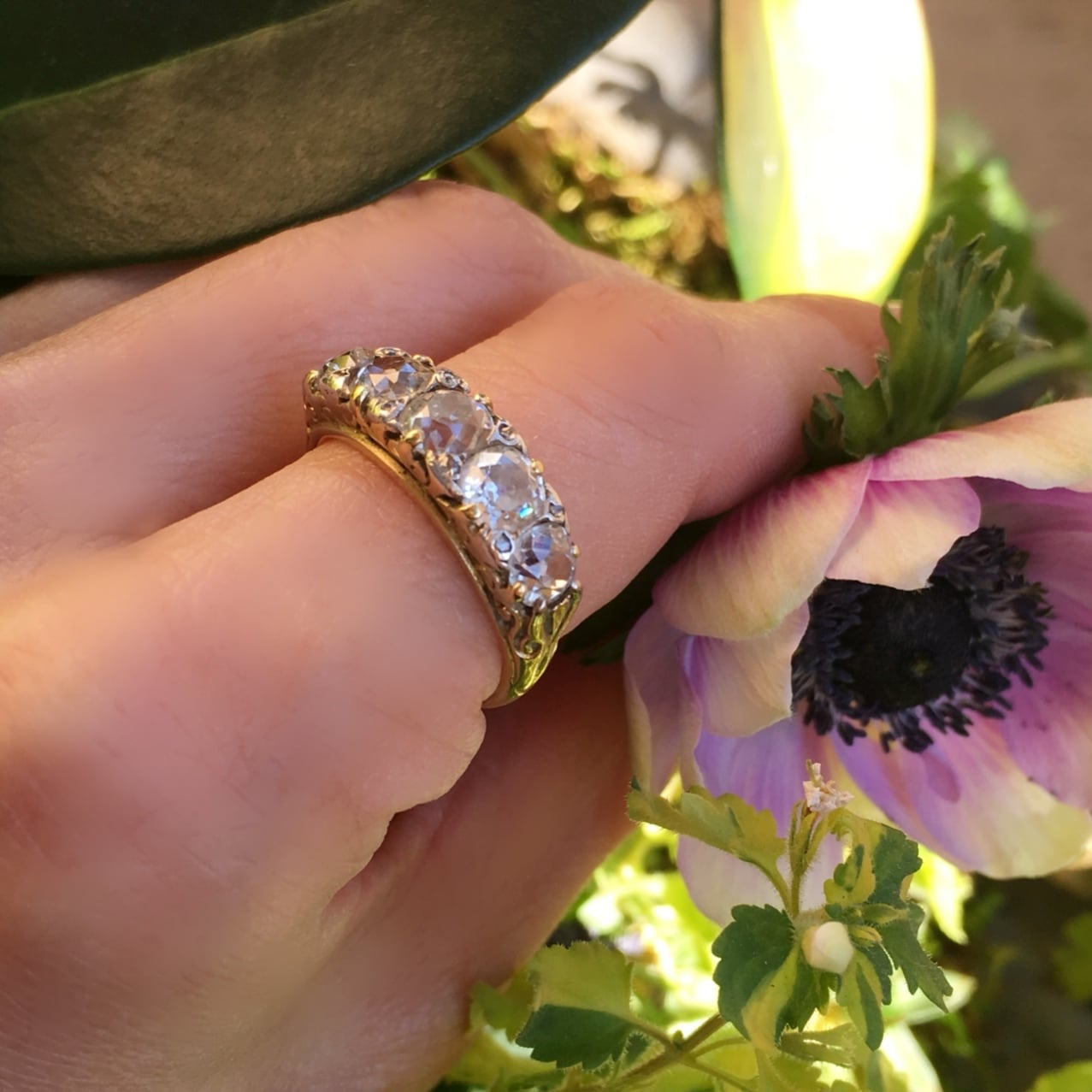 驚くほどの厚みと大きさのオールドヨーロピアンカットのダイヤモンドを5つ並べたファイブストーンリングです。ヴィクトリア時代中期に流行したスタイルでイエローゴールドのアラベスク模様の台座にオープンセッティングでゴロゴロと厚みのあるダイヤモンドがセットされたリングは圧倒的な光を放ちます。