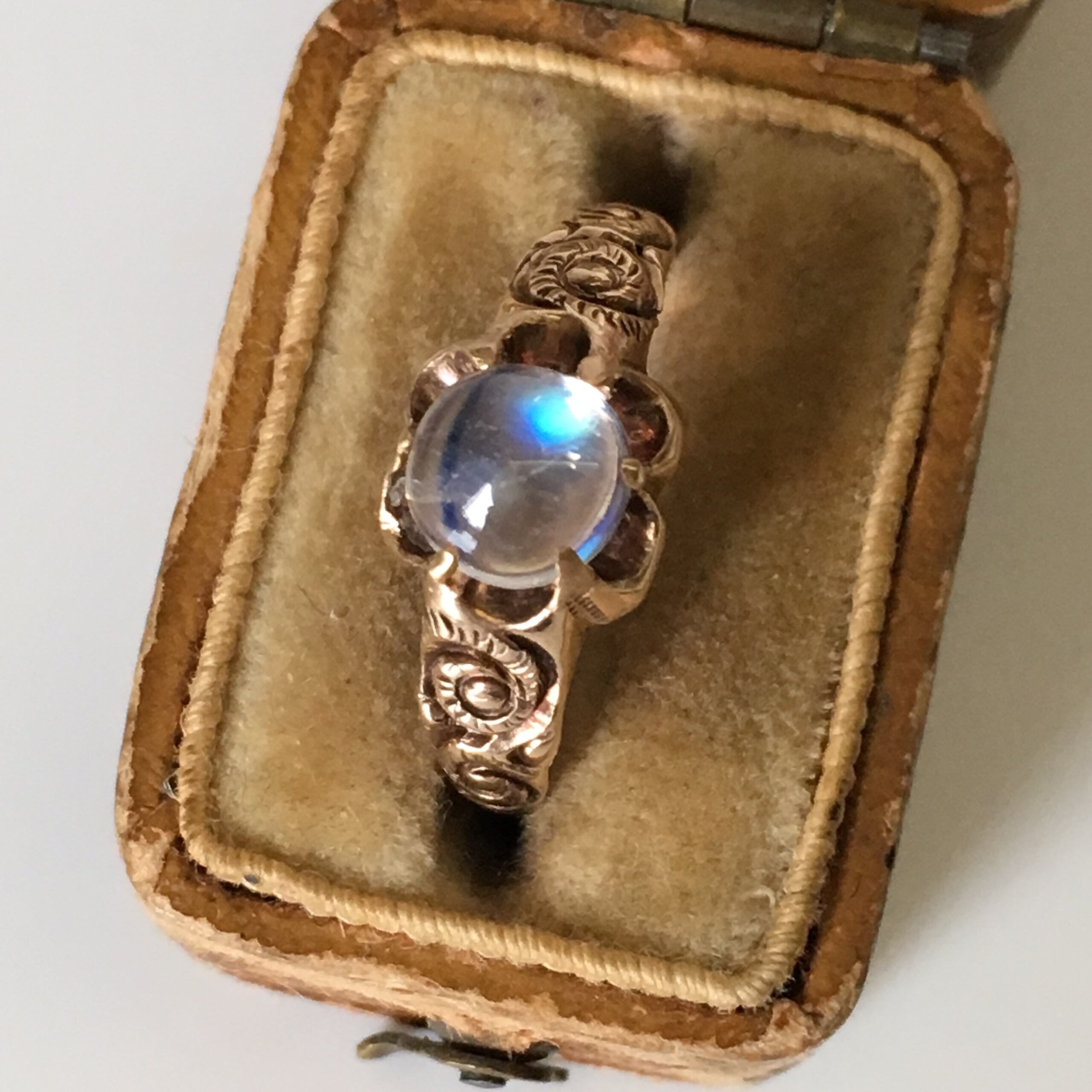 唐草模様のエングレイヴィングが施されたローズゴールドの台座に曇り空の満月の夜に消えては現れる月のような妖艶な光を放つヴィクトリア時代に制作されたと思われる人気のブルームーンストーンリングが入荷いたしました。