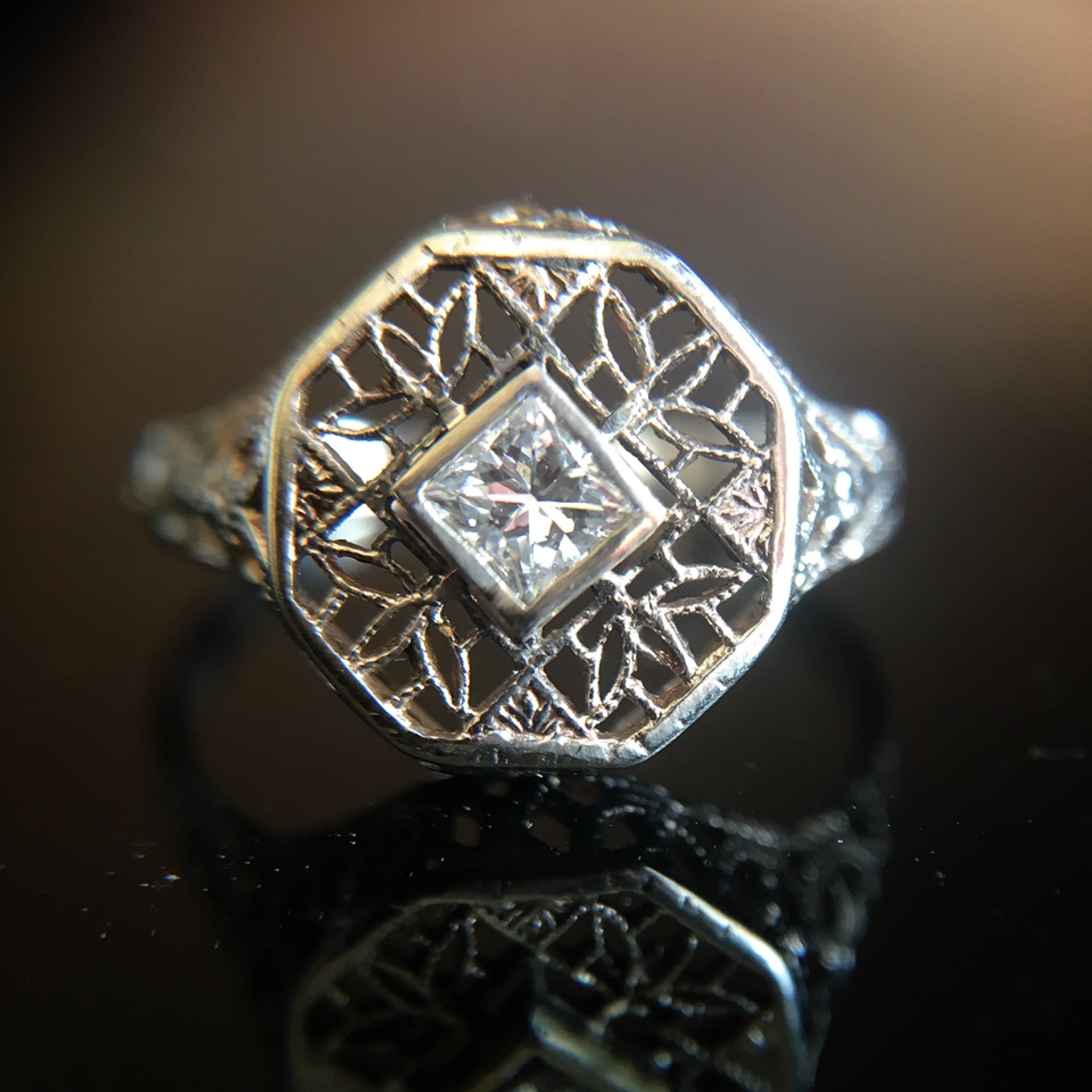 雪の結晶のような今にも溶けてしまいそうなまでに繊細な透かし模様のレースワークが美しいフィリグリーのリングはアールデコ期に製作されたと思われます。