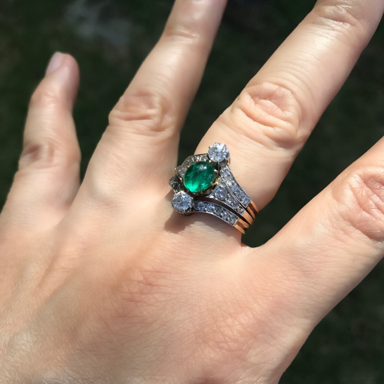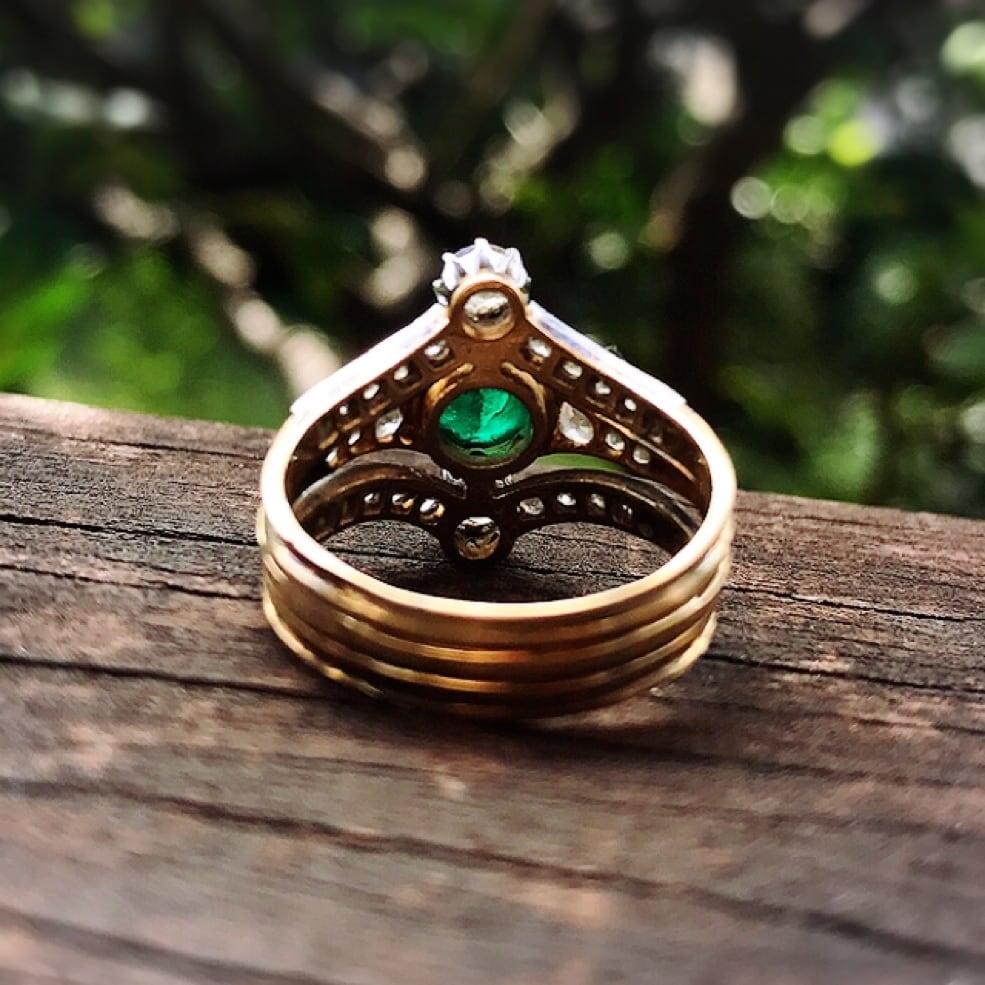 アンティークのカボションエメラルド独特のトロリとした艶感と煌めく木漏れ日のようにセットされたオールドヨーロピアンカットダイヤモンドが美しいリングです。