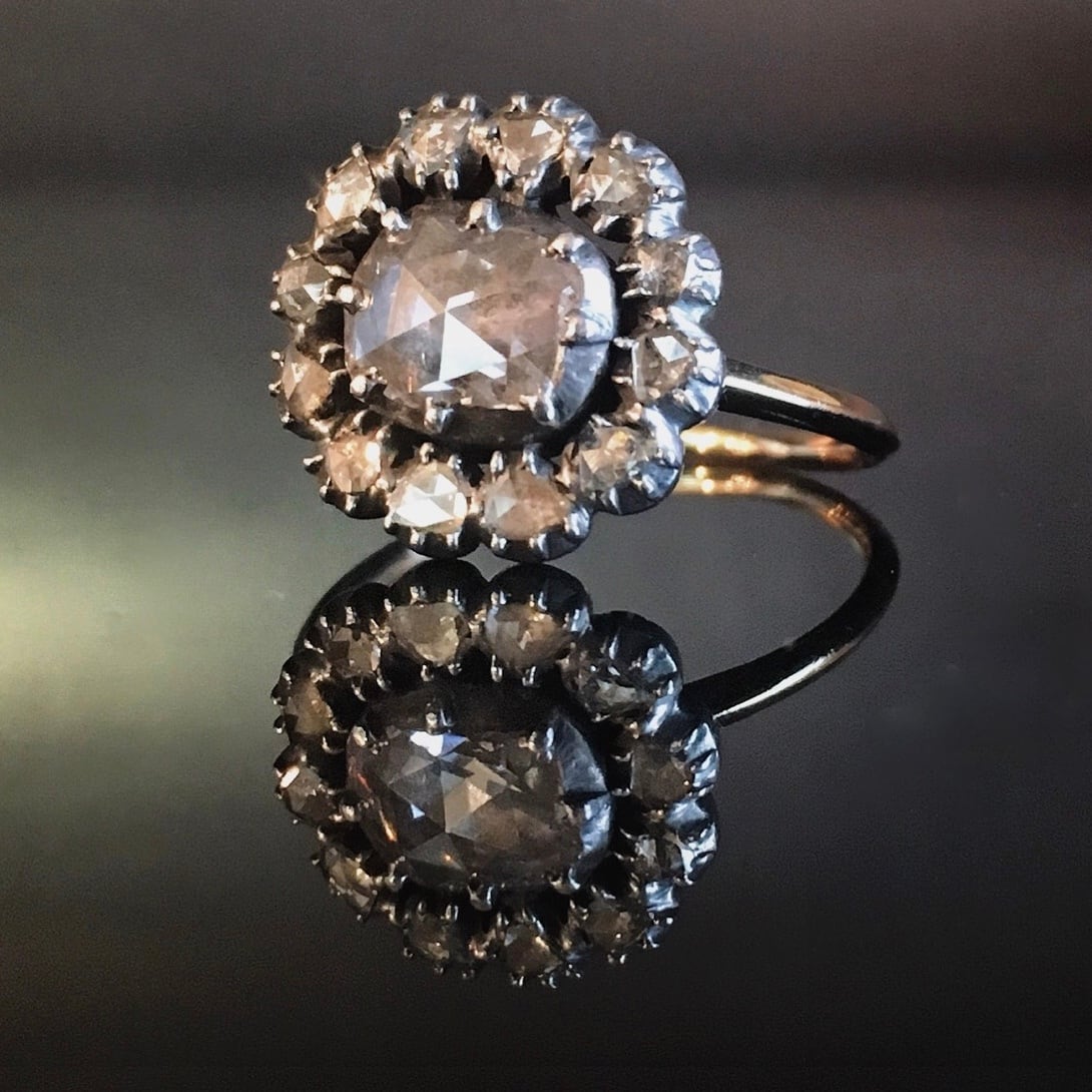 このリングが制作された頃は当然今のように電気は無く、夜の舞踏会など社交界のローソクの光の元でキラキラと美しい輝きを放つローズカットのダイヤモンドの光は王侯貴族を魅了したことでしょう。